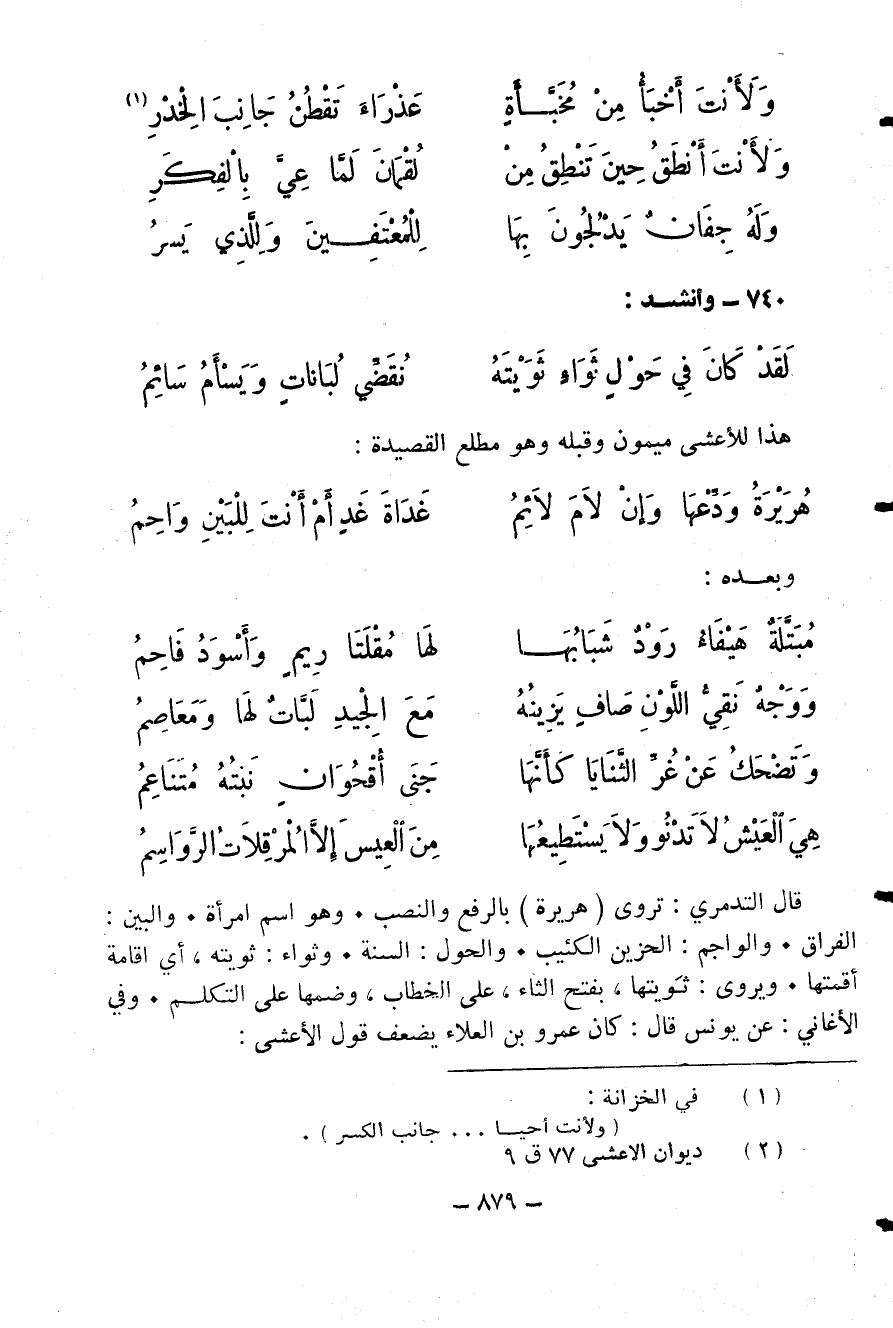 الفراق. والواجم: الحزين الكئيب. والحول: السنة. وثواء: ثويته، أي اقامة أقمتها. ويروى: ثويتها، بفتح الثاء، على الخطاب، وضمها على التكلم. وفي الأغاني: عن يونس قال: كان عمرو بن العلاء يضعف قول الأعشى: