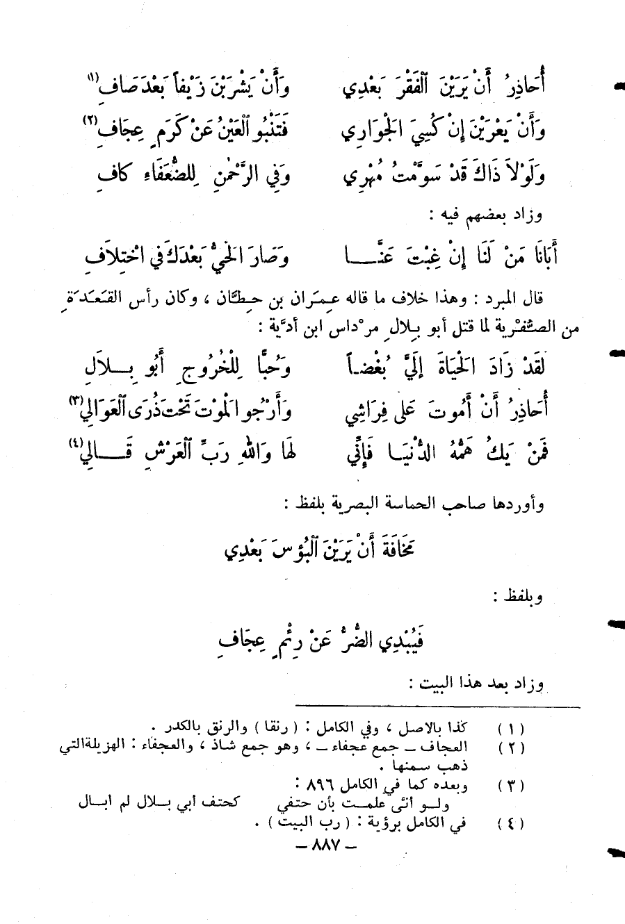 قال المبرد: وهذا خلاف ما قاله عمران بن حطّان، وكان رأس القعدة من الصّفرية لما قتل أبو بلال مرداس ابن أدّية: