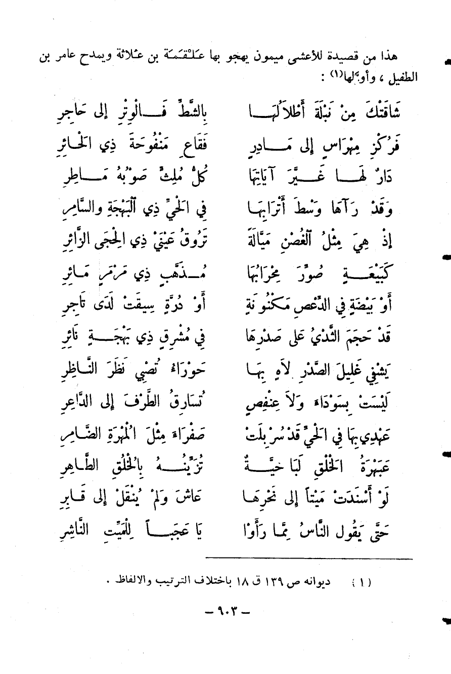 هذا من قصيدة للأعشى ميمون يهجو بها علقمة بن علاثة ويمدح عامر بن الطفيل، وأوّلها (¬1):