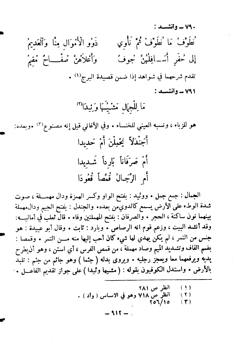الجمال: جمع جمل. ووئيد: بفتح الواو وكسر الهمزة ودال مهملة، صوت شدة الوطء على الأرض يسمع كالدوي من بعده. والجندل: بفتح الجيم ودال مهملة بينهما نون ساكنة، الحجر. والصرفان: بفتح المهملتين وفاء. قال ثعلب في أماليه: