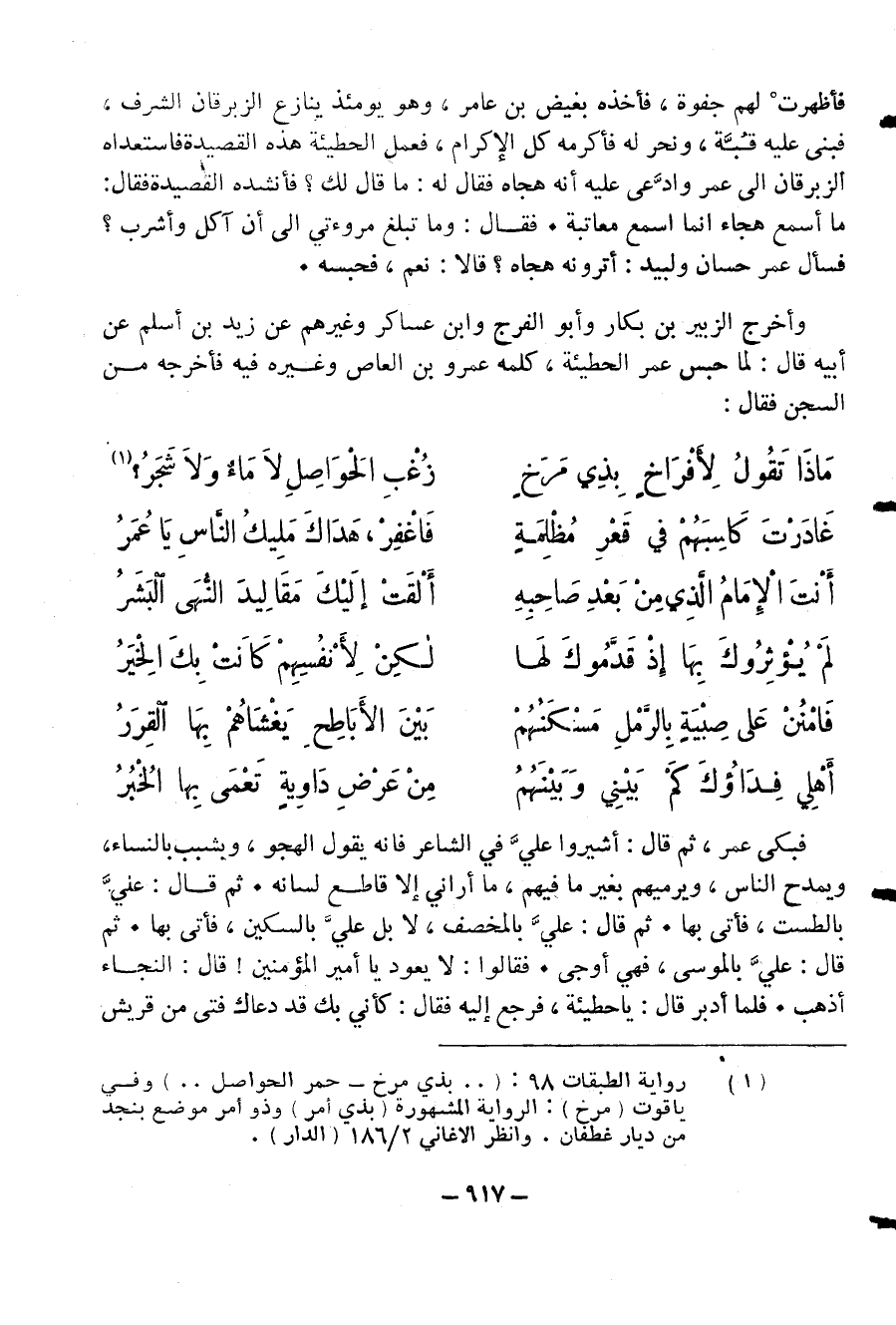 وأخرج الزبير بن بكار وأبو الفرج وابن عساكر وغيرهم عن زيد بن أسلم عن أبيه قال: لما حبس عمر الحطيئة، كلمه عمرو بن العاص وغيره فيه فأخرجه من السجن فقال:
