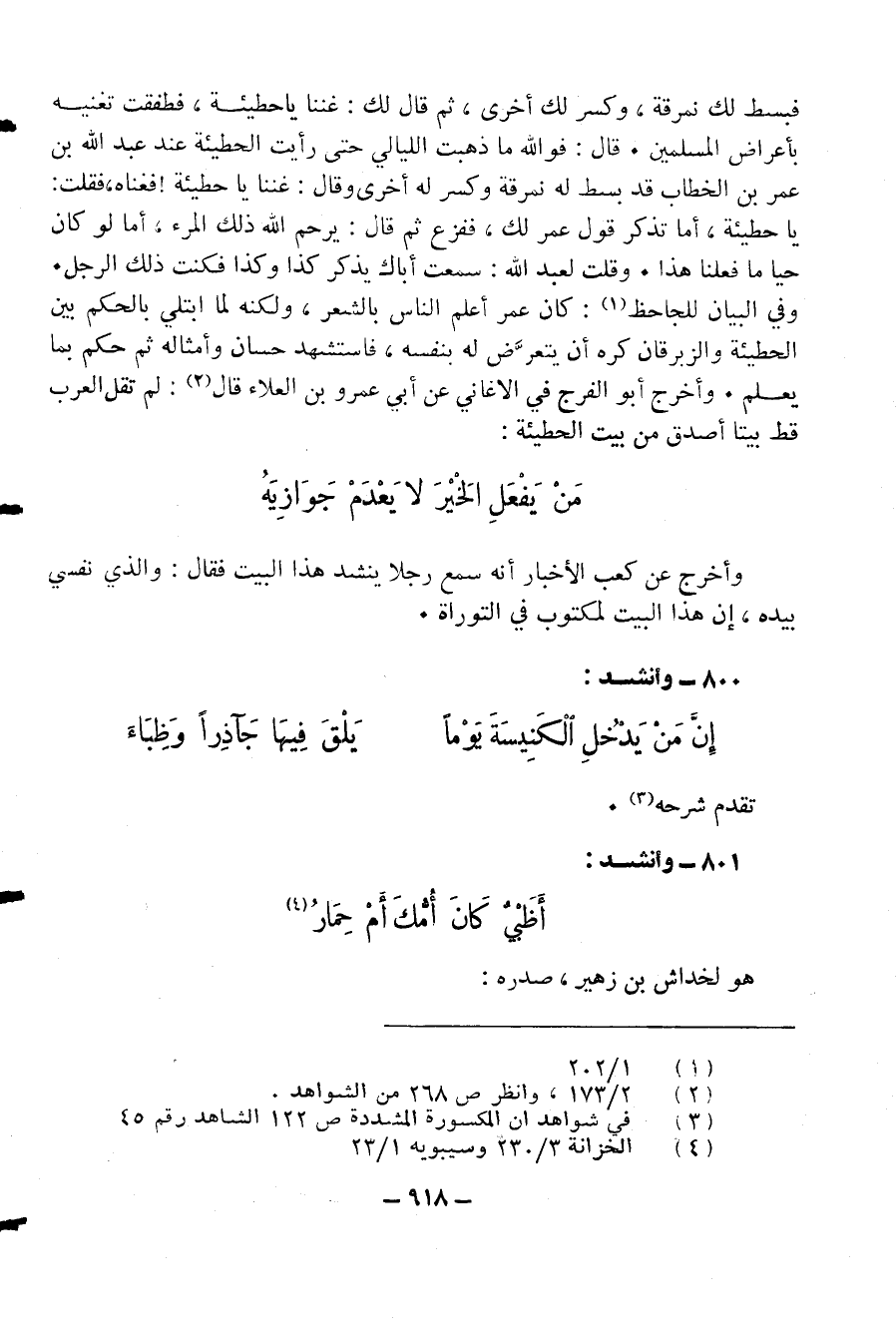 وفي البيان للجاحظ (¬1): كان عمر أعلم الناس بالشعر، ولكنه لما ابتلي بالحكم بين الحطيئة والزبرقان كره أن يتعرّض له بنفسه، فاستشهد حسان وأمثاله ثم حكم بما يعلم. وأخرج أبو الفرج في الاغاني عن أبي عمرو بن العلاء قال (¬2): لم تقل العرب قط بيتا أصدق من بيت الحطيئة: