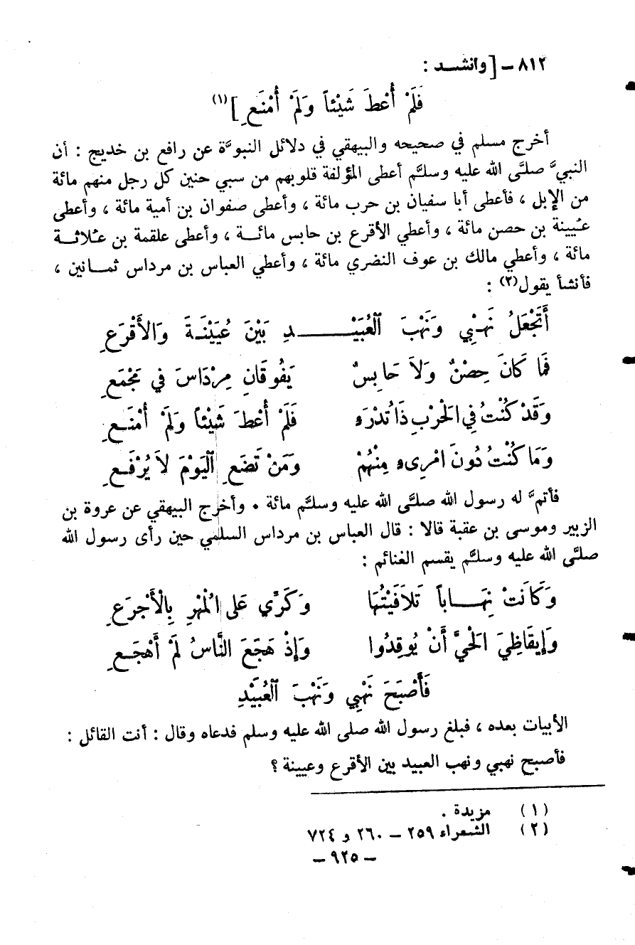 أخرج مسلم في صحيحه والبيهقي في دلائل النبوّة عن رافع بن خديج: أن النبيّ صلّى الله عليه وسلّم أعطى المؤلفة قلوبهم من سبي حنين كل رجل منهم مائة من الإبل، فأعطى أبا سفيان بن حرب مائة، وأعطى صفوان بن أمية مائة، وأعطى عيينة بن حصن مائة، وأعطي الأقرع بن حابس مائة، وأعطى علقمة بن علاثة مائة، وأعطي مالك بن عوف النضري مائة، وأعطي العباس بن مرداس ثمانين، فأنشأ يقول (¬2):