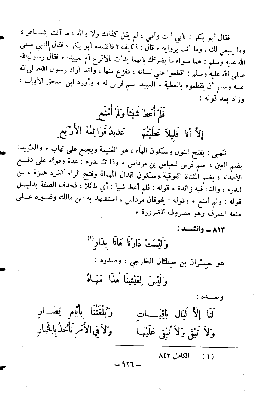 فقال أبو بكر: بأبي أنت وأمي، لم يقل كذلك ولا والله، ما أنت بشاعر، وما ينبغي لك، وما أنت برواية. قال: فكيف؟ فأنشده أبو بكر، فقال النبي صلى الله عليه وسلم: هما سواء ما يضرّك بأيهما بدأت بالأقرع أم بعيينة. فقال رسول الله صلى الله عليه وسلم: اقطعوا عني لسانه، ففزع منها، وانما أراد رسول الله صلى الله عليه وسلم أن يقطعوه بالعطية. العبيد اسم فرس له. وأورد ابن اسحق الأبيات، وزاد بعد قوله: