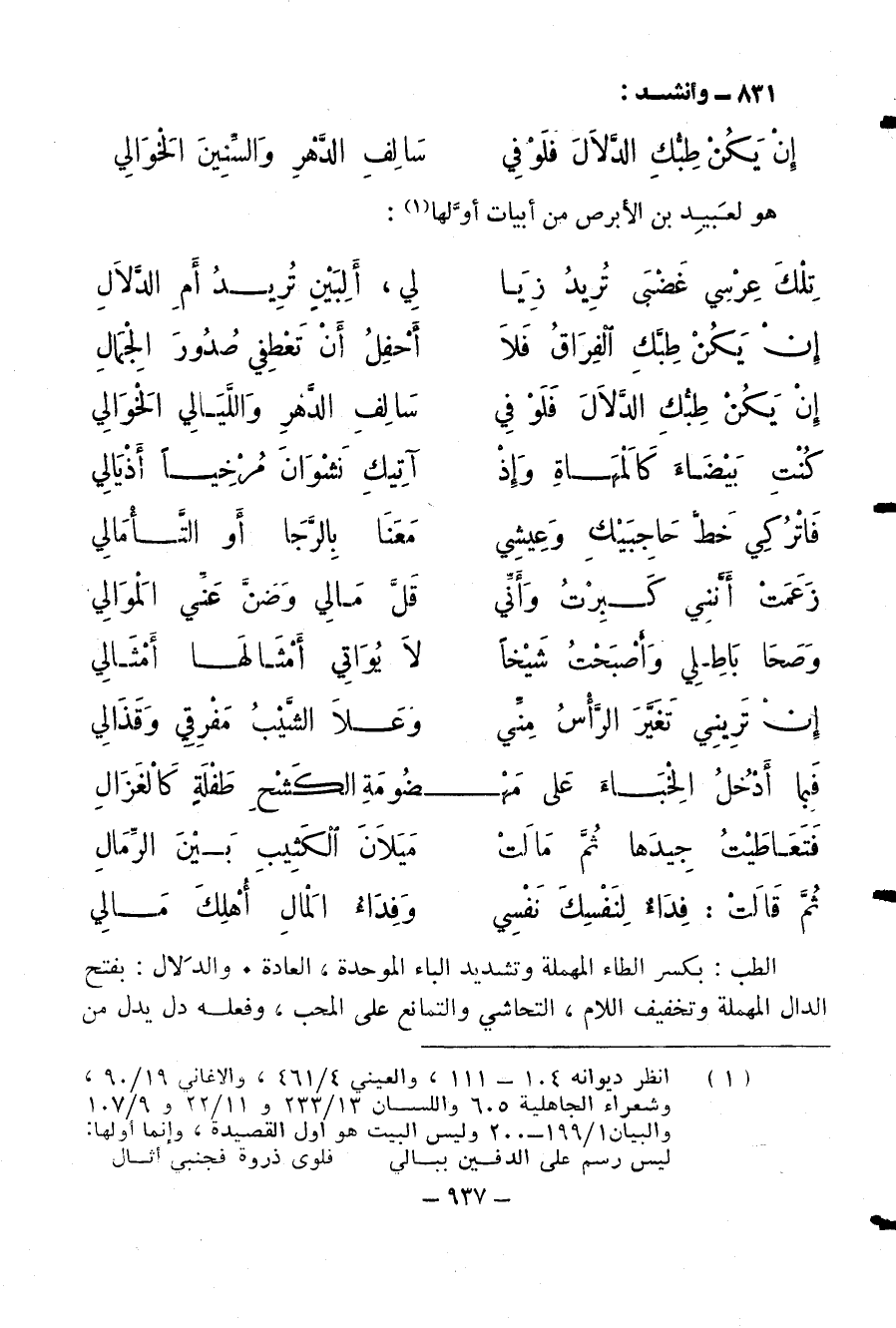 (¬1) انظر ديوانه 104 - 111، والعيني 4/ 461، والاغاني 19/ 90، وشعراء الجاهلية 605 واللسان 13/ 233 و 11/ 22 و 9/ 107 والبيان 1/ 199 - 200 وليس البيت هو اول القصيدة، وإنما أولها: