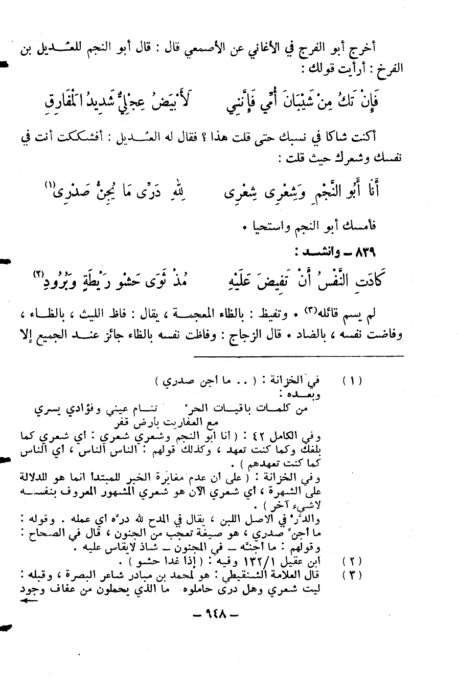 أخرج أبو الفرج في الأغاني عن الأصمعي قال: قال أبو النجم للعديل بن الفرخ: أرأيت قولك: