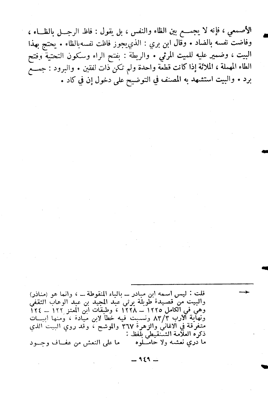 = قلت: ليس اسمه ابن مبادر - بالباء المنقوطة -، وانما هو (مناذر) والبيت من قصيدة طويلة يرثي عبد المجيد بن عبد الوهاب الثقفي وهي في الكامل 1225 - 1228، وطبقات ابن المعتز 122 - 124 ونهاية الأرب 3/ 83 ونسبت فيه خطأ لابن ميادة، ومنها أبيات متفرقة في الاغاني والزهرة 367 والموشح، وقد روي البيت الذي ذكره العلامة الشنقيطي بلفظ: