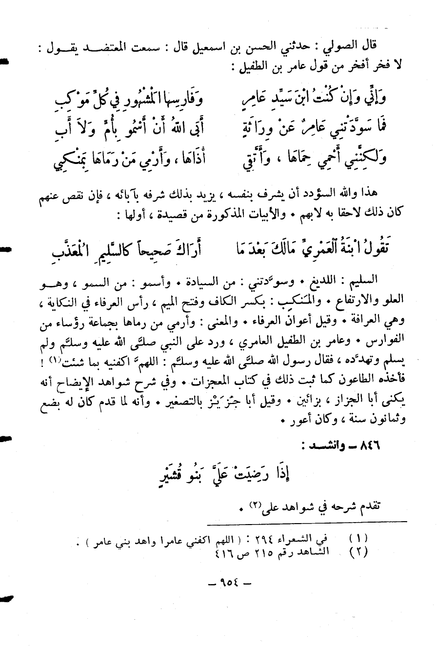 السليم: اللديغ. وسوّدتني: من السيادة. وأسمو: من السمو، وهو العلو والارتفاع. والمنكب: بكسر الكاف وفتح الميم، رأس العرفاء في النكاية، وهي العرافة. وقيل أعوان العرفاء. والمعنى: وأرمي من رماها بجماعة رؤساء من الفوارس. وعامر بن الطفيل العامري، ورد على النبي صلّى الله عليه وسلّم ولم يسلم وتهدّده، فقال رسول الله صلّى الله عليه وسلّم: اللهمّ اكفنيه بما شئت (¬1)! فأخذه الطاعون كما ثبت ذلك في كتاب المعجزات. وفي شرح شواهد الإيضاح أنه يكنى أبا الجزاز، بزائين. وقيل أبا جزيز بالتصغير. وأنه لما قدم كان له بضع وثمانون سنة، وكان أعور.