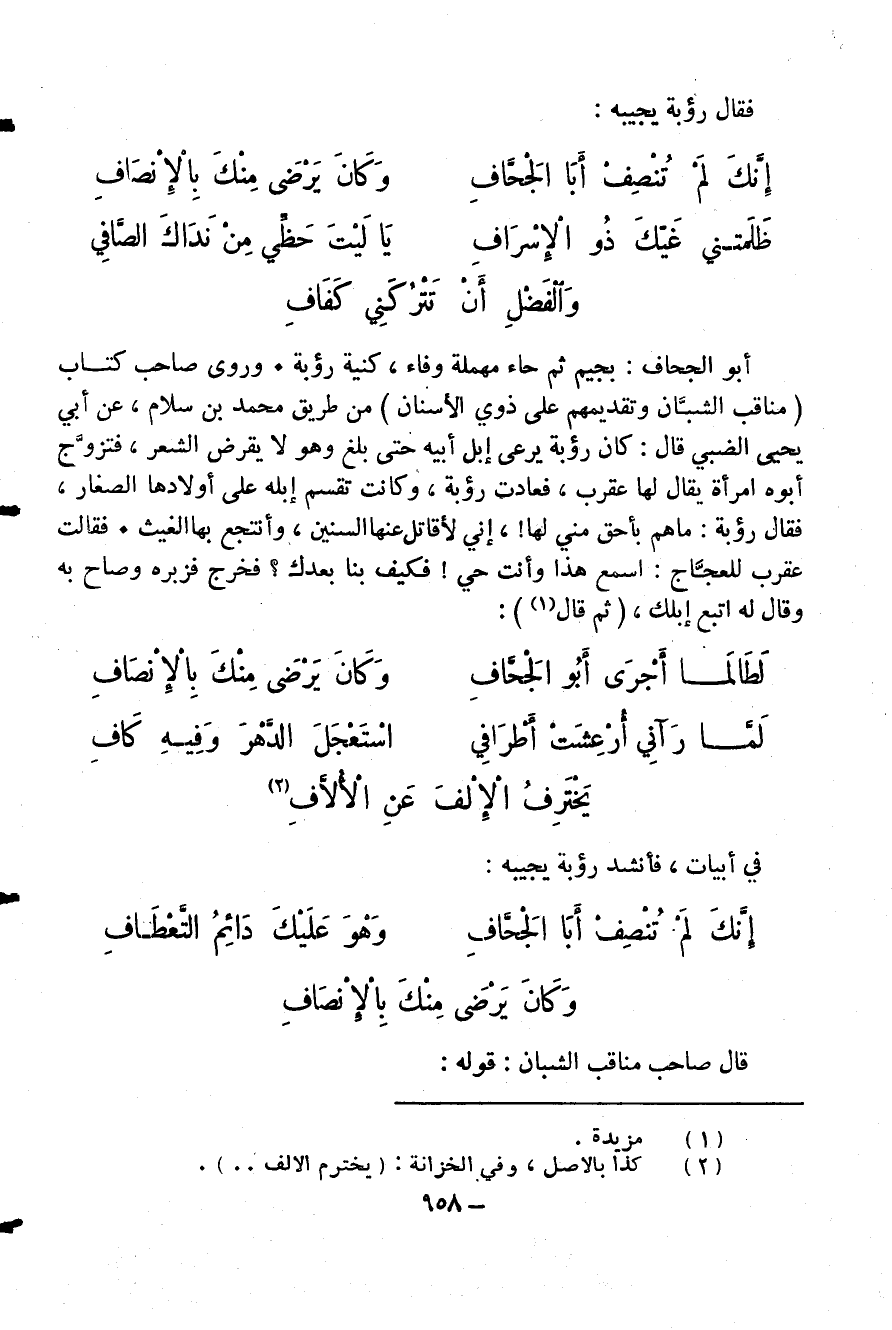 أبو الجحاف: بجيم ثم حاء مهملة وفاء، كنية رؤبة. وروى صاحب كتاب (مناقب الشبّان وتقديمهم على ذوي الأسنان) من طريق محمد بن سلام، عن أبي يحيى الضبي قال: كان رؤبة يرعى إبل أبيه حتى بلغ وهو لا يقرض الشعر، فتزوّج أبوه امرأة يقال لها عقرب، فعادت رؤبة، وكانت تقسم إبله على أولادها الصغار، فقال رؤبة: ما هم بأحق مني لها!، إني لأقاتل عنها السنين، وأنتجع بها الغيث. فقالت عقرب للعجّاج: اسمع هذا وأنت حي! فكيف بنا بعدك؟ فخرج فزبره وصاح به وقال له اتبع إبلك، (ثم قال) (¬1).