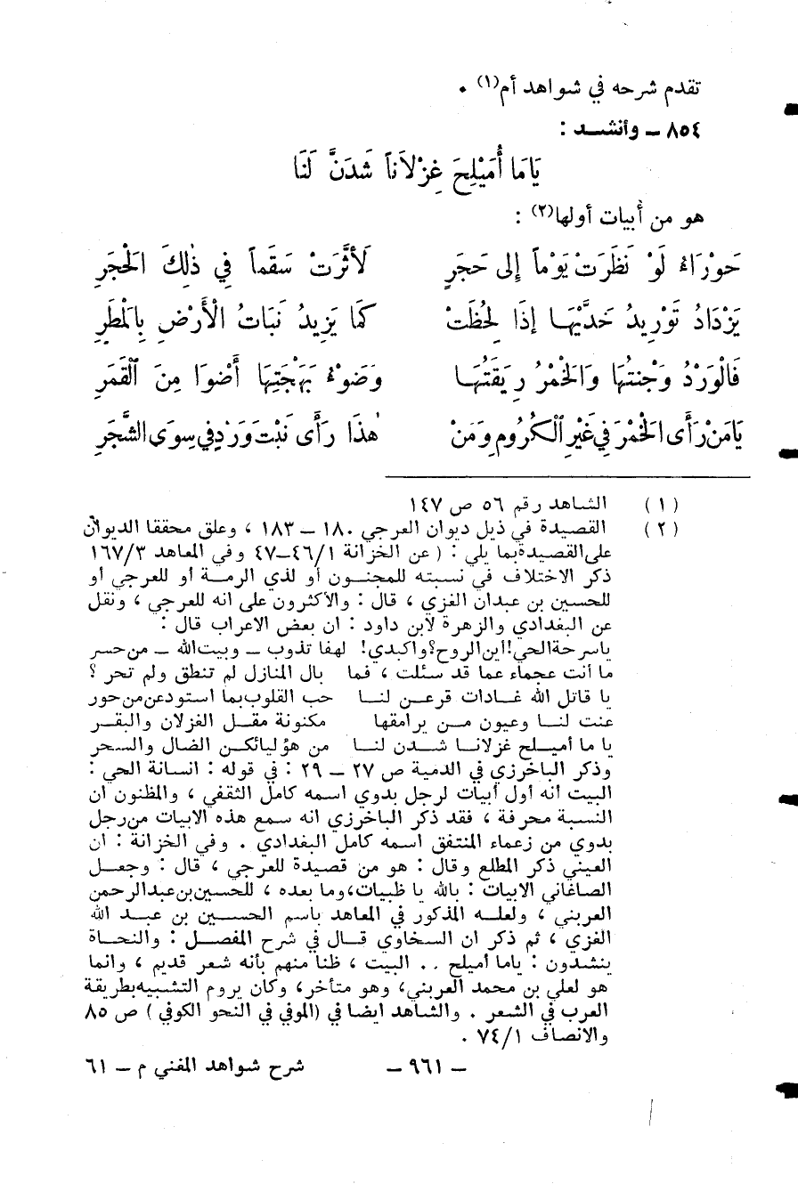 (¬2) القصيدة في ذيل ديوان العرجي 180 - 183، وعلق محققا الديوان على القصيدة بما يلي: (عن الخزانة 1/ 46 - 47 وفي المعاهد 3/ 167 ذكر الاختلاف في نسبته للمجنون أو لذي الرمة أو للعرجي أو للحسين بن عبدان الغزي، قال: والأكثرون على انه للعرجي، ونقل عن البغدادي والزهرة لابن داود: أن بعض الاعراب قال: