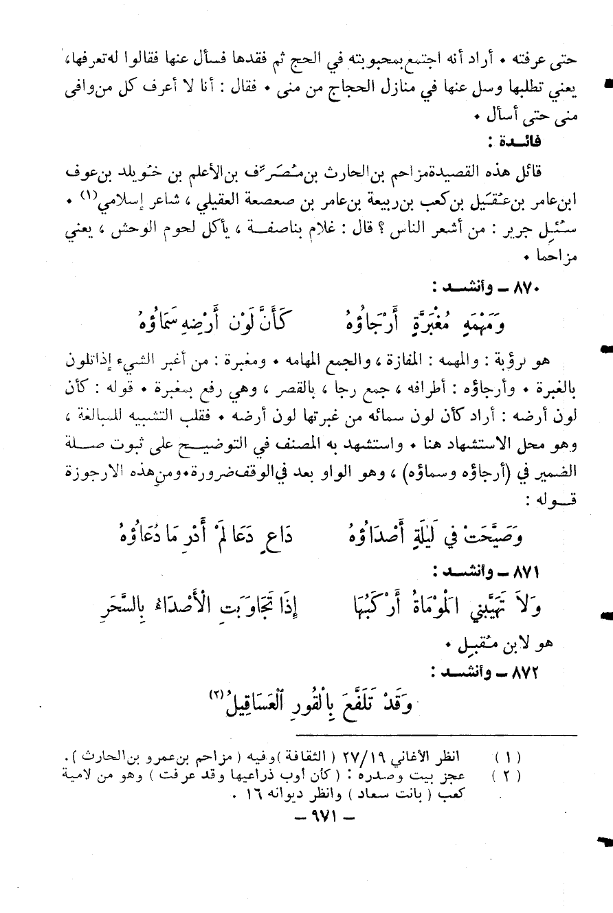 هو برؤبة: والمهمه: المفازة، والجمع المهامه. ومغبرة: من أغبر الشيء إذا تلون بالغبرة. وأرجاؤه: أطرافه، جمع رجا، بالقصر، وهي رفع بمغبرة قوله: كأن لون أرضه: أراد كأن لون سمائه من غبرتها لون أرضه. فقلب التشبيه للمبالغة، وهو محل الاستشهاد هنا. واستشهد به المصنف في التوضيح على ثبوت صلة الضمير في (أرجاؤه وسماؤه)، وهو الواو بعد في الوقف ضرورة. ومن هذه الارجوزة قوله: