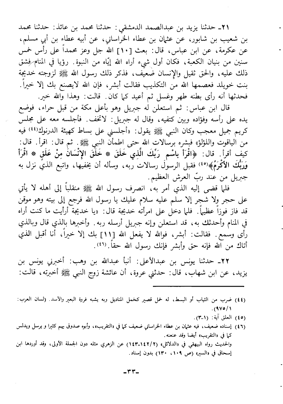 21 - حَدَّثَنَا يَزِيدُ بْنُ عَبْدِ الصَّمَدِ الدِّمَشْقِيُّ، حَدَّثَنَا مُحَمَّدُ بْنُ عَائِذٍ، حَدَّثَنَا مُحَمَّدُ بْنُ شُعَيْبِ بْنِ شَابُورَ، عَنْ عُثْمَانَ بْنِ عَطَاءٍ الْخُرَاسَانِيِّ، عَنْ أَبِيهِ عَطَاءِ بْنِ أَبِي مُسْلِمٍ عَنْ عِكْرِمَةَ، عَنِ ابْنِ عَبَّاسٍ، قَالَ: " §بَعَثَ اللَّهُ جَلَّ وَعَزَّ مُحَمَّدًا عَلَى رَأْسِ خَمْسِ سِنِينَ مِنْ بُنْيَانِ الْكَعْبَةِ فَكَانَ أَوَّلَ شَيْءٍ أَرَاهُ اللَّهُ إِيَّاهُ مِنَ النُّبُوَّةِ رُؤْيَا فِي الْمَنَامِ فَشَقَّ ذَلِكَ عَلَيْهِ وَالْحَقُّ ثَقِيلٌ وَالْإِنْسَانُ ضَعِيفٌ فَذَكَرَ ذَلِكَ رَسُولُ اللَّهِ صَلَّى اللهُ عَلَيْهِ وَسَلَّمَ لِزَوْجَتِهِ خَدِيجَةَ بِنْتِ خُوَيْلِدٍ فَعَصَمَهَا اللَّهُ مِنَ التَّكْذِيبِ فَقَالَتْ: أَبْشِرْ فَإِنَّ اللَّهَ لَا يَصْنَعُ بِكَ إِلَّا خَيْرًا فَحَدَّثَهَا أَنَّهُ رَأَى بَطْنَهُ طُهِّرَ وَغُسِلَ ثُمَّ أُعِيدَ كَمَا كَانَ قَالَتْ: وَهَذَا وَاللَّهِ خَيْرٌ قَالَ ابْنُ عَبَّاسٍ: ثُمَّ اسْتَعْلَنَ لَهُ جِبْرِيلُ وَهُوَ بِأَعْلَى مَكَّةَ مِنْ قِبَلِ حِرَاءٍ فَوَضَعَ يَدَهُ عَلَى رَأْسِهِ وَفُؤَادِهِ وَبَيْنَ كَتِفَيْهِ وَقَالَ لَهُ جِبْرِيلُ: لَا تَخَفْ فَأَجْلَسَهُ مَعَهُ عَلَى مَجْلِسٍ كَرِيمٍ جَمِيلٍ مُعْجَبٍ وَكَانَ النَّبِيُّ صَلَّى اللهُ عَلَيْهِ وَسَلَّمَ يَقُولُ: أَجْلَسَنِي عَلَى بِسَاطٍ كَهَيْئَةِ الدُّرْنُوكِ فِيهِ مِنَ الْيَاقُوتِ وَاللُّؤْلُؤِ، فَبَشَّرَهُ بِرِسَالَاتِ اللَّهِ حَتَّى اطْمَأَنَّ النَّبِيُّ صَلَّى اللهُ عَلَيْهِ وَسَلَّمَ ثُمَّ قَالَ: اقْرَأْ قَالَ: كَيْفَ أَقْرَأُ؟ قَالَ: {اقْرَأْ بِاسْمِ رَبِّكِ الَّذِي خَلَقَ خَلَقَ الْإِنْسَانَ مِنْ عَلَقٍ اقْرَأْ وَرَبُّكَ الْأَكْرَمُ} [العلق: 2] فَقَبِلَ الرَّسُولُ رِسَالَاتِ رَبِّهِ وَسَأَلَهُ أَنْ يُخْفِيَهَا وَاتَّبَعَ الَّذِي نَزَلَ بِهِ جِبْرِيلُ مِنْ عِنْدِ رَبِّ الْعَرْشِ الْعَظِيمِ فَلَمَّا قَضَى إِلَيْهِ الَّذِي أُمِرَ بِهِ انْصَرَفَ رَسُولُ اللَّهِ صَلَّى اللهُ عَلَيْهِ وَسَلَّمَ مُنْقَلِبًا إِلَى أَهْلِهِ لَا يَأْتِي عَلَى حَجَرٍ وَلَا شَجَرٍ إِلَّا سَلَّمَ عَلَيْهِ: سَلَامٌ عَلَيْكَ يَا رَسُولَ اللَّهِ فَرَجَعَ إِلَى بَيْتِهِ وَهُوَ مُوقِنٌ قَدْ فَازَ فَوْزًا عَظِيمًا فَلَمَّا دَخَلَ عَلَى امْرَأَتِهِ خَدِيجَةَ قَالَ: يَا خَدِيجَةُ أَرَأَيْتِ مَا كُنْتُ أُرَاهُ فِي الْمَنَامِ وَأُحَدِّثُكِ بِهِ قَدِ اسْتَعْلَنَ وَإِنَّهُ جِبْرِيلُ أَرْسَلَهُ رَبُّهُ، وَأَخْبَرَهَا بِالَّذِي قَالَ وَبِالَّذِي رَأَى وَسَمِعَ فَقَالَتْ: أَبْشِرْ فَوَاللَّهِ لَا يَفْعَلُ اللَّهُ بِكَ إِلَّا خَيْرًا أَنَا أَقْبَلُ الَّذِي أَتَاكَ مِنَ اللَّهِ فَإِنَّهُ حَقٌّ وَأَبْشِرْ فَإِنَّكَ رَسُولُ اللَّهِ حَقًّا "