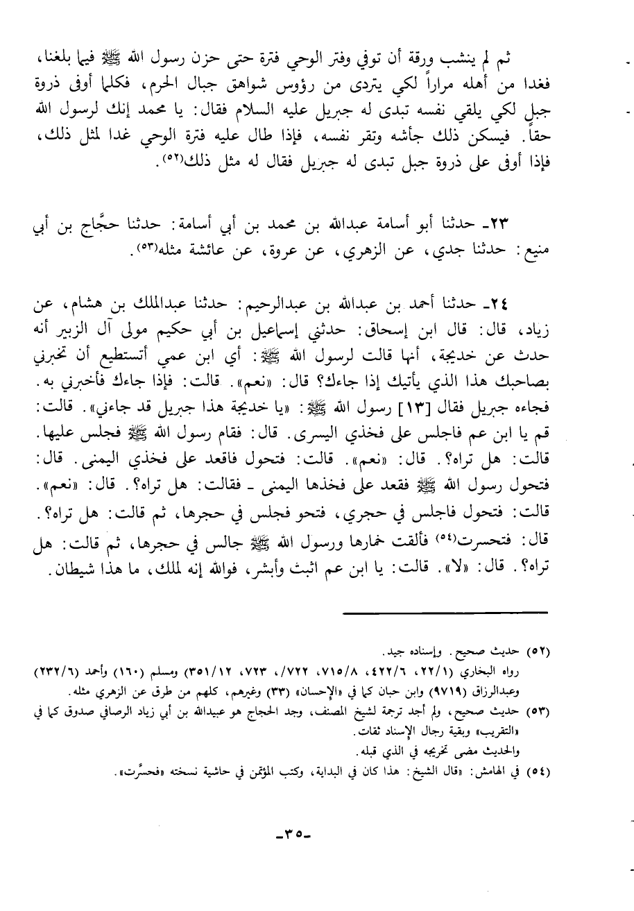 24 - حَدَّثَنَا أَحْمَدُ بْنُ عَبْدِ اللَّهِ بْنِ عَبْدِ الرَّحِيمِ، حَدَّثَنَا عَبْدُ الْمَلِكِ بْنُ هِشَامٍ، عَنْ زِيَادٍ، قَالَ: قَالَ ابْنُ إِسْحَاقَ: حَدَّثَنِي إِسْمَاعِيلُ بْنُ أَبِي حَكِيمٍ، مَوْلَى آلِ الزُّبَيْرِ أَنَّهُ حُدِّثَ عَنْ خَدِيجَةَ، أَنَّهَا قَالَتْ لِرَسُولِ اللَّهِ صَلَّى اللهُ عَلَيْهِ وَسَلَّمَ: " أَيِ ابْنَ عَمِّي أَتَسْتَطِيعُ أَنْ تُخْبِرَنِي، بِصَاحِبِكَ هَذَا الَّذِي يَأْتِيكَ إِذَا جَاءَكَ؟ قَالَ: «نَعَمْ» ، قَالَتْ: فَإِذَا جَاءَكَ فَأَخْبِرْنِي بِهِ فَجَاءَهُ جِبْرِيلُ فَقَالَ رَسُولُ اللَّهِ صَلَّى اللهُ عَلَيْهِ وَسَلَّمَ: «§يَا خَدِيجَةُ هَذَا جِبْرِيلُ قَدْ جَاءَنِي» ، قَالَتْ: قُمْ يَا ابْنَ عَمِّي فَاجْلِسْ عَلَى فَخِذِي الْيُسْرَى قَالَ: فَقَامَ رَسُولُ اللَّهِ صَلَّى اللهُ عَلَيْهِ وَسَلَّمَ فَجَلَسَ عَلَيْهَا قَالَتْ: هَلْ تَرَاهُ؟ قَالَ: «نَعَمْ» ، قَالَتْ: فَتَحَوَّلْ فَاقْعُدْ عَلَى فَخِذِي الْيُمْنَى قَالَ: فَتَحَوَّلَ رَسُولُ اللَّهِ صَلَّى اللهُ عَلَيْهِ وَسَلَّمَ فَقَعَدَ عَلَى فَخْذِهَا الْيُمْنَى، فَقَالَتْ: هَلْ تَرَاهُ؟ قَالَ: «نَعَمْ» ، قَالَتْ: فَتَحَوَّلْ فَاجْلِسْ فِي حِجْرِي فَتَحَوَّلَ فَجَلَسَ فِي حِجْرِهَا ثُمَّ قَالَتْ: هَلْ تَرَاهُ قَالَ: فَتَحَسَّرَتْ فَأَلْقَتْ خِمَارَهَا وَرَسُولُ اللَّهِ صَلَّى اللهُ عَلَيْهِ وَسَلَّمَ جَالِسٌ فِي حِجْرِهَا، ثُمَّ قَالَتْ: هَلْ تَرَاهُ؟ قَالَ: لَا. قَالَتْ: يَا ابْنَ عَمِّي اثْبُتْ وَأَبْشِرْ فَوَاللَّهِ إِنَّهُ لَمَلَكٌ مَا هَذَا شَيْطَانٌ -[36]- قَالَ ابْنُ إِسْحَاقَ: وَقَدْ حَدَّثْتُ بِهَذَا الْحَدِيثِ عَبْدَ اللَّهِ بْنَ حَسَنٍ فَقَالَ: قَدْ سَمِعْتُ أُمِّي فَاطِمَةَ بِنْتَ حُسَيْنٍ تُحَدِّثُ بِهَذَا عَنْ خَدِيجَةَ إِلَّا أَنِّي سَمِعْتُهَا، تَقُولُ: إِذْ خَلَّتْ رَسُولَ اللَّهِ صَلَّى اللهُ عَلَيْهِ وَسَلَّمَ بَيْنَهَا وَبَيْنَ دِرْعِهَا فَذَهَبَ عِنْدَ ذَلِكَ جِبْرِيلُ فَقَالَتْ خَدِيجَةُ لِرَسُولِ اللَّهِ صَلَّى اللهُ عَلَيْهِ وَسَلَّمَ: إِنَّ هَذَا مَلَكٌ وَمَا هُوَ بِشَيْطَانٍ "