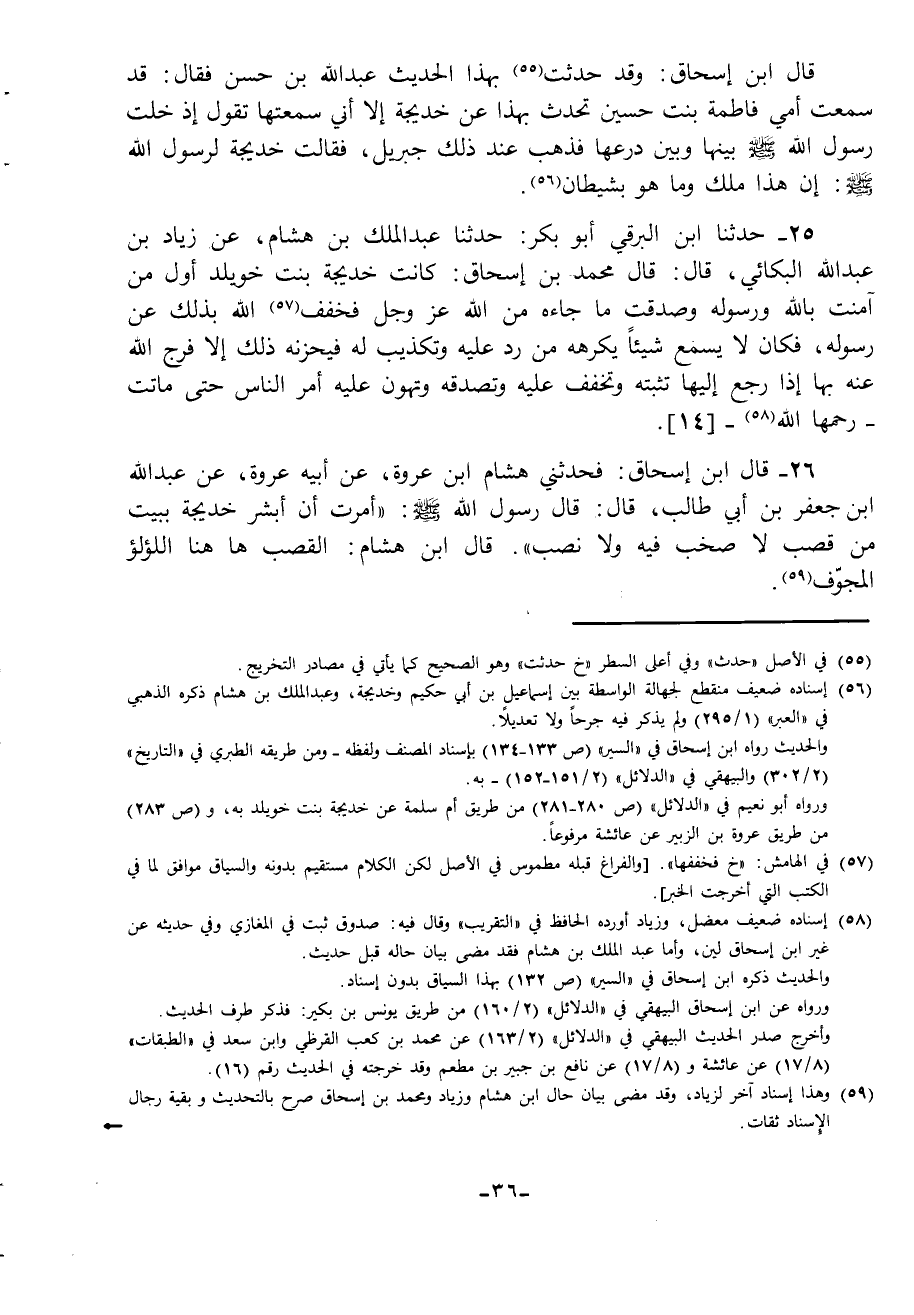 26 - قَالَ ابْنُ إِسْحَاقَ: فَحَدَّثَنِي هِشَامُ بْنُ عُرْوَةَ، عَنْ أَبِيهِ عُرْوَةَ عَنْ عَبْدِ اللَّهِ بْنِ جَعْفَرِ بْنِ أَبِي طَالِبٍ، قَالَ: قَالَ رَسُولُ اللَّهِ صَلَّى اللهُ عَلَيْهِ وَسَلَّمَ: «§أُمِرْتُ أَنْ أُبَشِّرَ خَدِيجَةَ بِبَيْتٍ مِنْ قَصَبٍ لَا صَخَبَ فِيهِ وَلَا نَصَبَ» قَالَ ابْنُ هِشَامٍ: الْقَصَبُ هَاهُنَا اللُّؤْلُؤُ الْمُجَوَّفُ "