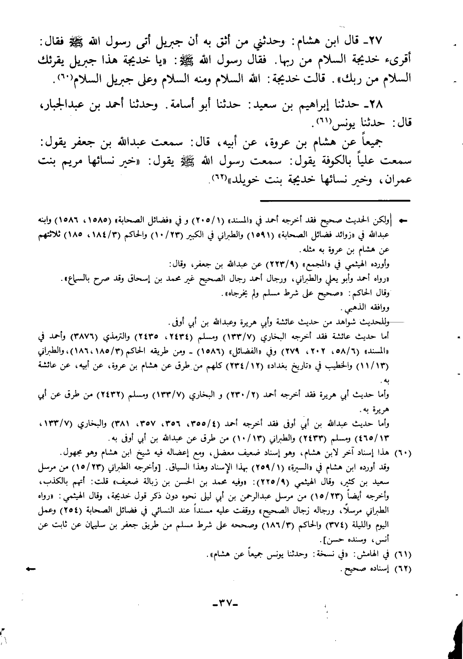 28 - حَدَّثَنَا إِبْرَاهِيمُ بْنُ سَعِيدٍ، حَدَّثَنَا أَبُو أُسَامَةَ، وَحَدَّثَنَا أَحْمَدُ بْنُ عَبْدِ الْجَبَّارِ، قَالَ: حَدَّثَنَا يُونُسُ جَمِيعًا عَنْ هِشَامِ بْنِ عُرْوَةَ، عَنْ أَبِيهِ، قَالَ: سَمِعْتُ عَبْدَ اللَّهِ بْنَ جَعْفَرٍ، يَقُولُ: سَمِعْتُ عَلِيًّا، بِالْكُوفَةِ يَقُولُ سَمِعْتُ رَسُولَ اللَّهِ صَلَّى اللهُ عَلَيْهِ وَسَلَّمَ يَقُولُ: «§خَيْرُ نِسَائِهَا مَرْيَمُ بِنْتُ عِمْرَانَ وَخَيْرُ نِسَائِهَا خَدِيجَةُ بِنْتُ خُوَيْلِدٍ»