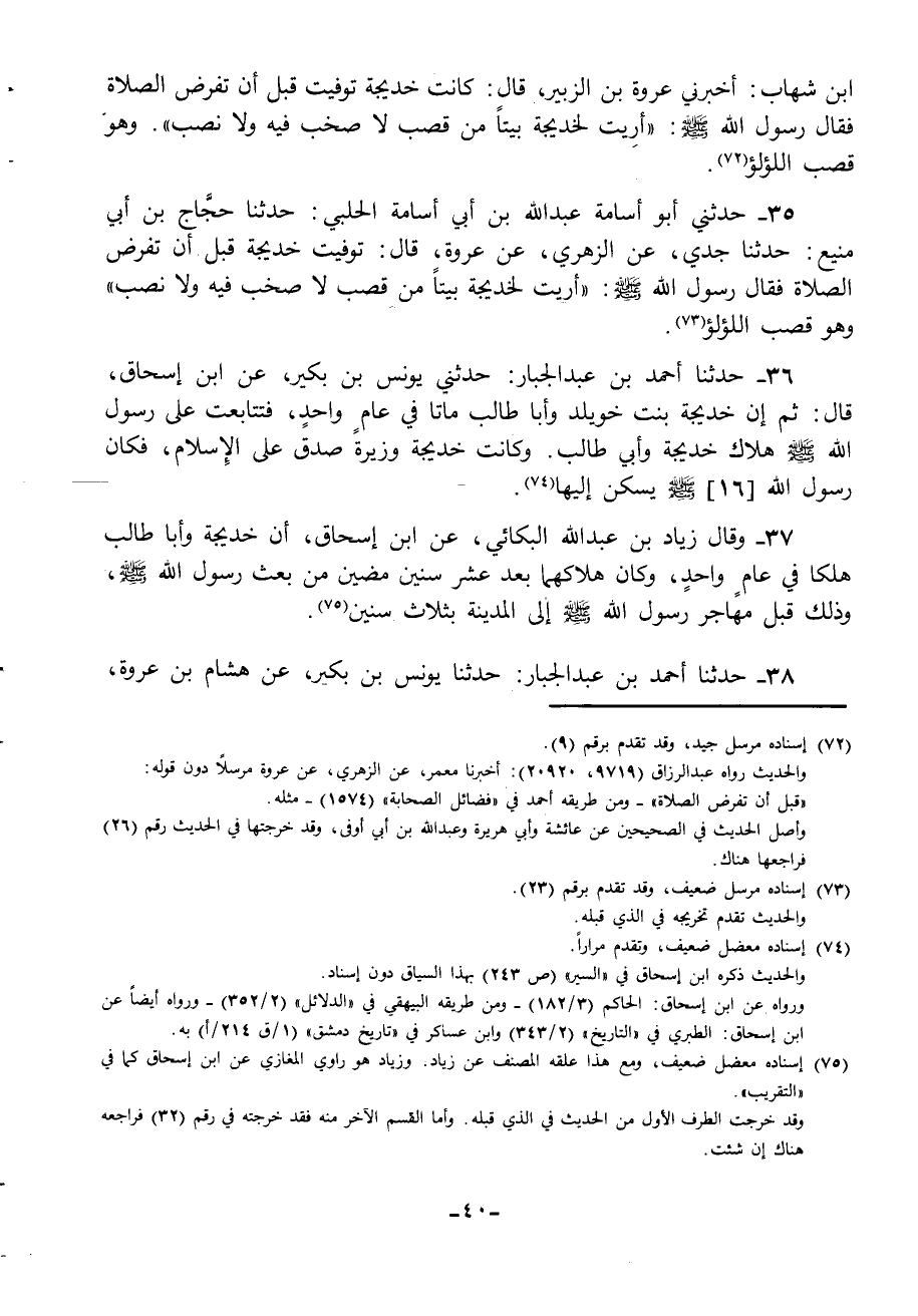 35 - حَدَّثَنِي أَبُو أُسَامَةَ عَبْدُ اللَّهِ بْنُ أَبِي أُسَامَةَ الْحَلَبِيُّ، حَدَّثَنَا حَجَّاجُ بْنُ أَبِي مَنِيعٍ، حَدَّثَنَا جَدِّي، عَنِ الزُّهْرِيِّ، عَنْ عُرْوَةَ، قَالَ: " تُوُفِّيَتْ خَدِيجَةُ قَبْلَ أَنْ تُفْرَضَ الصَّلَاةُ، فَقَالَ رَسُولُ اللَّهِ صَلَّى اللهُ عَلَيْهِ وَسَلَّمَ: «§أُرِيتُ لِخَدِيجَةَ بَيْتًا مِنْ قَصَبٍ لَا صَخَبَ فِيهِ وَلَا نَصَبَ وَهُوَ قَصَبُ اللُّؤْلُؤِ»