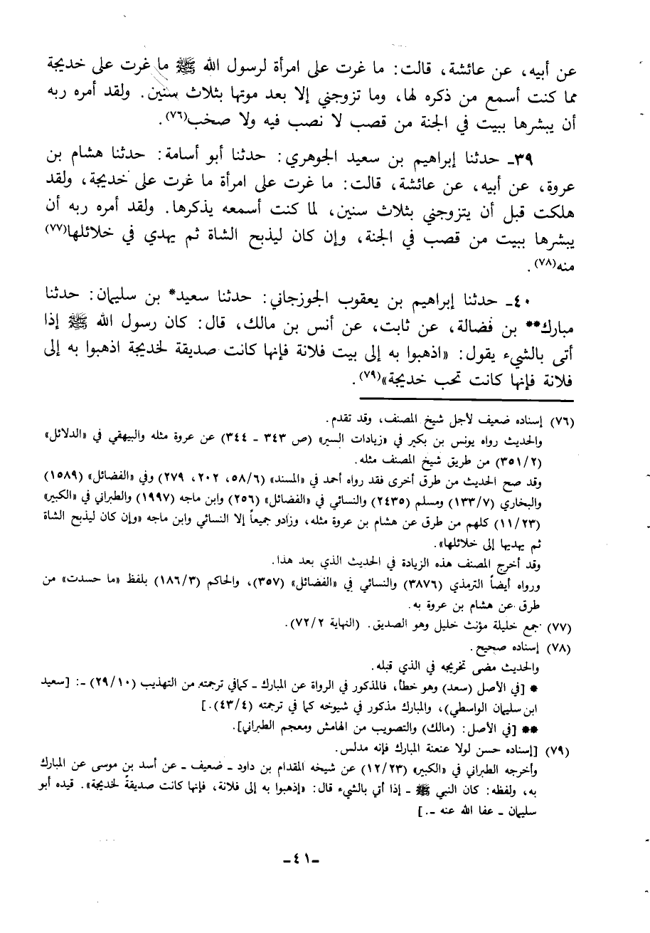 40 - حَدَّثَنَا إِبْرَاهِيمُ بْنُ يَعْقُوبَ الْجَوْزَجَانِيُّ، حَدَّثَنَا سَعِيدُ بْنُ سُلَيْمَانَ، حَدَّثَنَا مُبَارَكُ بْنُ فَضَالَةَ، عَنْ ثَابِتٍ، عَنْ أَنَسِ بْنِ مَالِكٍ، قَالَ: كَانَ رَسُولُ اللَّهِ صَلَّى اللهُ عَلَيْهِ وَسَلَّمَ إِذَا أُتِيَ بِالشَّيْءِ يَقُولُ: «§اذْهَبُوا بِهِ إِلَى بَيْتِ فُلَانَةَ فَإِنَّهَا كَانَتْ صَدِيقَةً لِخَدِيجَةَ اذْهَبُوا بِهِ إِلَى فُلَانَةَ فَإِنَّهَا كَانَتْ تُحِبُّ خَدِيجَةَ»