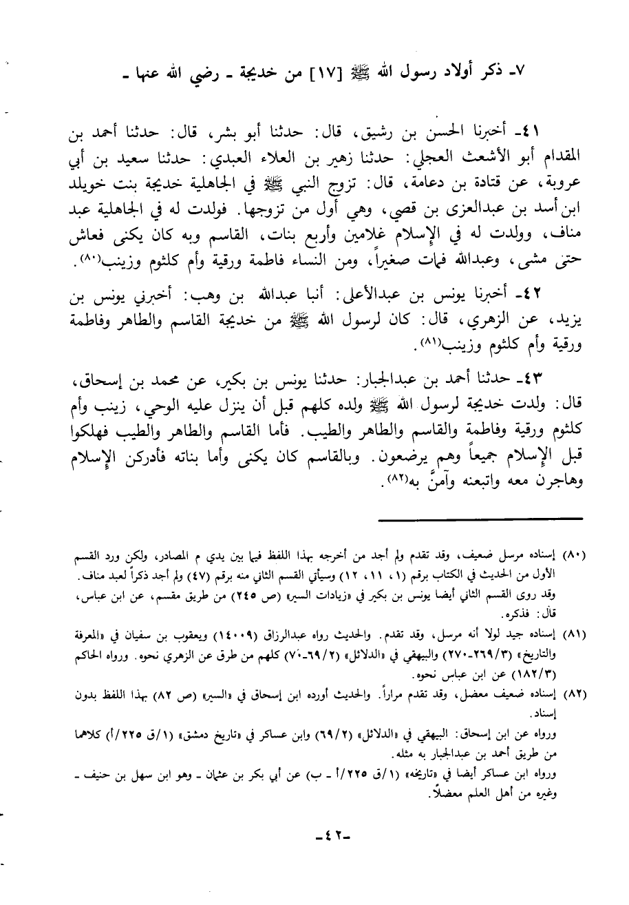 43 - حَدَّثَنَا أَحْمَدُ بْنُ عَبْدِ الْجَبَّارِ، حَدَّثَنَا يُونُسُ بْنُ بُكَيْرٍ، عَنْ مُحَمَّدِ بْنِ إِسْحَاقَ، قَالَ: " §وَلَدَتْ خَدِيجَةُ لِرَسُولِ اللَّهِ صَلَّى اللهُ عَلَيْهِ وَسَلَّمَ وَلَدَهُ كُلَّهُمْ قَبْلَ أَنْ يَنْزِلَ عَلَيْهِ الْوَحْيُ: زَيْنَبُ وَأُمُّ كُلْثُومٍ وَرُقَيَّةُ وَفَاطِمَةُ وَالْقَاسِمُ وَالطَّاهِرُ وَالطَّيِّبُ فَأَمَّا الْقَاسِمُ وَالطَّاهِرُ وَالطَّيِّبُ فَهَلَكُوا قَبْلَ الْإِسْلَامِ جَمِيعًا وَهُمْ يُرْضَعُونَ وَبِالْقَاسِمِ كَانَ يُكَنَّى، وَأَمَّا بَنَاتُهُ فَأَدْرَكْنَ الْإِسْلَامَ وَهَاجَرْنَ مَعَهُ وَاتَّبَعْنَهُ وَآمَنَّ بِهِ "