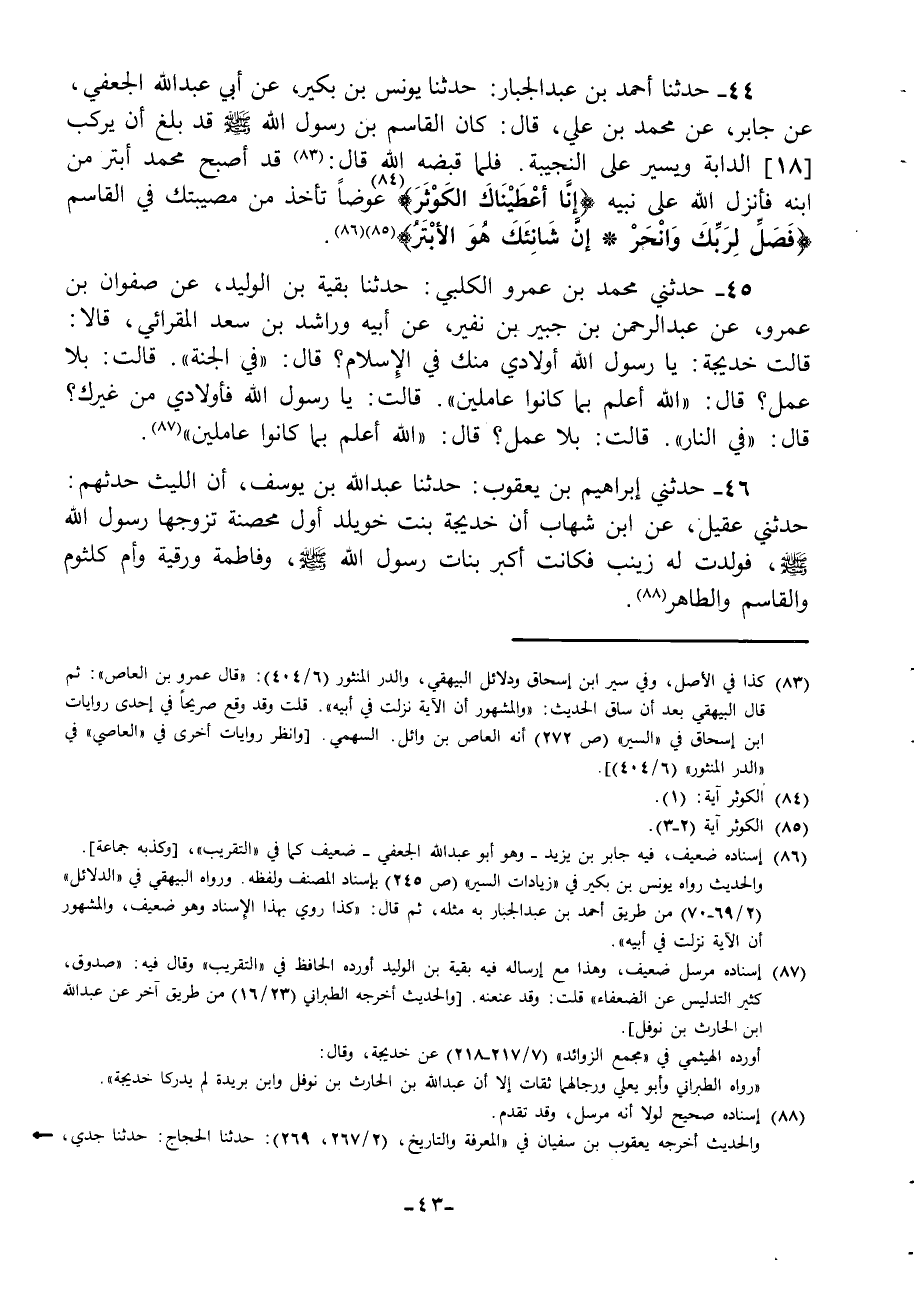 44 - حَدَّثَنَا أَحْمَدُ بْنُ عَبْدِ الْجَبَّارِ، حَدَّثَنَا يُونُسُ بْنُ بُكَيْرٍ، عَنْ أَبِي عَبْدِ اللَّهِ الْجُعْفِيِّ، عَنْ جَابِرٍ، عَنْ مُحَمَّدِ بْنِ عَلِيٍّ، قَالَ: " §كَانَ الْقَاسِمُ بْنُ رَسُولِ اللَّهِ صَلَّى اللهُ عَلَيْهِ وَسَلَّمَ قَدْ بَلَغَ أَنْ يَرْكَبَ، الدَّابَّةَ وَيَسِيرُ عَلَى النَّجِيبَةِ فَلَمَّا قَبَضَهُ اللَّهُ قَالَ: " قَدْ أَصْبَحَ مُحَمَّدٌ أَبْتَرَ مِنِ ابْنِهِ فَأَنْزَلَ اللَّهُ عَلَى نَبِيِّهِ {إِنَّا أَعْطَيْنَاكَ الْكَوْثَرَ} [الكوثر: 1] عِوَضًا تَأْخُذُ مِنْ مُصِيبَتِكَ فِي الْقَاسِمِ {فَصَلِّ لِرَبِّكَ وَانْحَرْ إِنَّ شَانِئَكَ هُوَ الْأَبْتَرُ} [الكوثر: 3] "