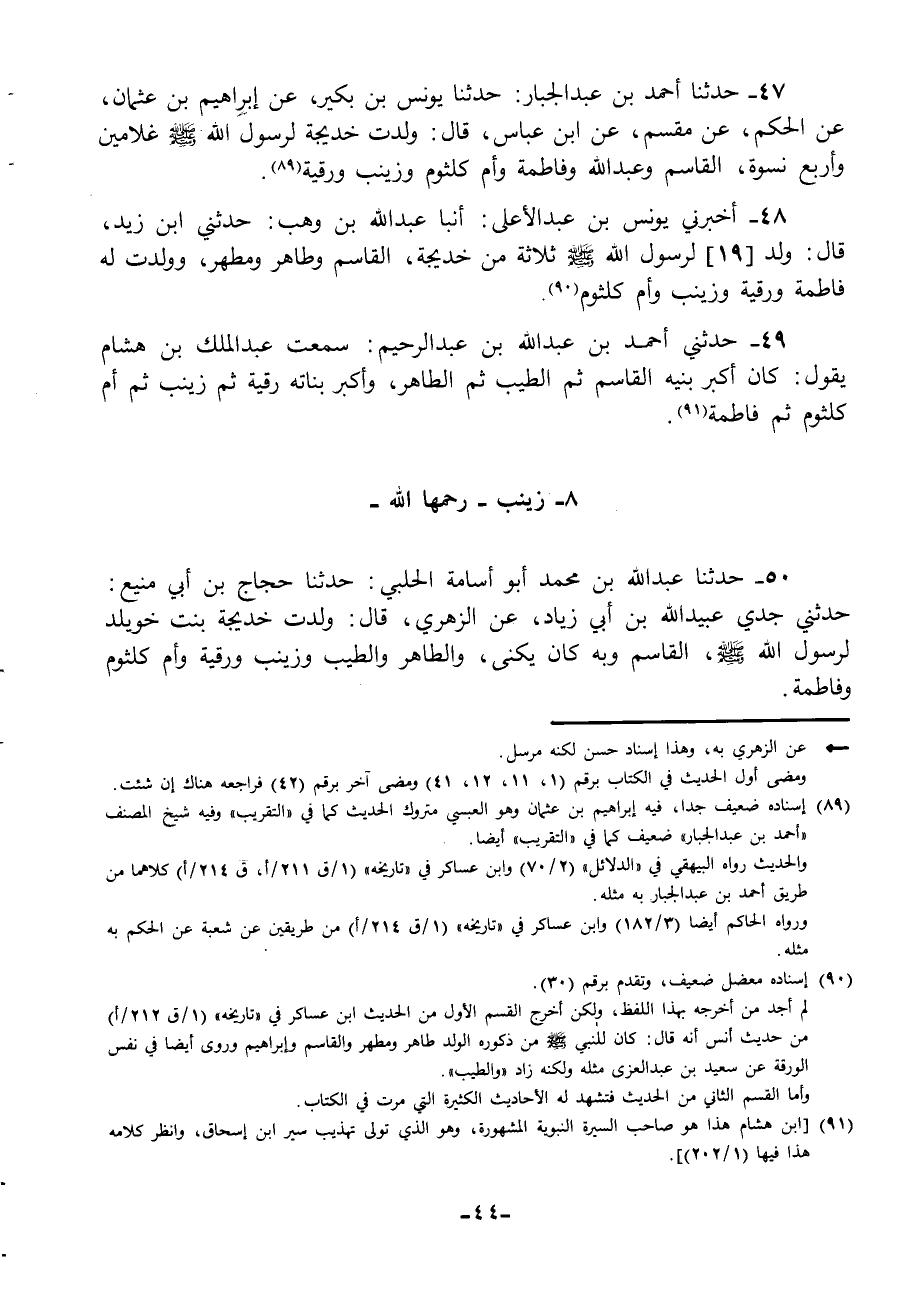 50 - حَدَّثَنَا عَبْدُ اللَّهِ بْنُ مُحَمَّدٍ أَبُو أُسَامَةَ الْحَلَبِيُّ، حَدَّثَنَا حَجَّاجُ بْنُ أَبِي مَنِيعٍ، حَدَّثَنِي جَدِّي، عُبَيْدُ اللَّهِ بْنُ أَبِي زِيَادٍ عَنِ الزُّهْرِيِّ، قَالَ: §وَلَدَتْ خَدِيجَةُ بِنْتُ خُوَيْلِدٍ لِرَسُولِ اللَّهِ صَلَّى اللهُ عَلَيْهِ وَسَلَّمَ الْقَاسِمَ وَبِهِ كَانَ يُكَنَّى وَالطَّاهِرَ وَالطَّيِّبَ وَزَيْنَبَ وَرُقَيَّةَ وَأُمَّ كُلْثُومٍ وَفَاطِمَةَ -[45]-، فَأَمَّا زَيْنَبُ بِنْتُ رَسُولِ اللَّهِ صَلَّى اللهُ عَلَيْهِ وَسَلَّمَ تَزَوَّجَهَا أَبُو الْعَاصِ بْنُ الرَّبِيعِ بْنِ عَبْدِ الْعُزَّى بْنِ عَبْدِ شَمْسِ بْنِ عَبْدِ مَنَافٍ فِي الْجَاهِلِيَّةِ فَوَلَدَتْ لِأَبِي الْعَاصِ جَارِيَةً اسْمُهَا أُمَامَةُ تَزَوَّجَهَا عَلِيُّ بْنُ أَبِي طَالِبٍ بَعْدَمَا تُوُفِّيَتْ فَاطِمَةُ بِنْتُ رَسُولِ اللَّهِ فَقُتِلَ عَلِيٌّ وَعِنْدَهُ أُمَامَةُ فَخَلَفَ عَلَى أُمَامَةَ بَعْدَ عَلِيِّ بْنِ أَبِي طَالِبٍ الْمُغِيرَةُ بْنُ نَوْفَلِ بْنِ الْحَارِثِ بْنِ عَبْدِ الْمُطَّلِبِ بْنِ هَاشِمٍ فَتُوُفِّيَتْ عِنْدَهُ، وَأُمُّ أَبِي الْعَاصِ بْنِ الرَّبِيعِ هَالَةُ بِنْتُ خُوَيْلِدِ بْنِ أَسَدٍ وَخَدِيجَةُ خَالَتُهُ أُخْتُ أُمِّهِ "
