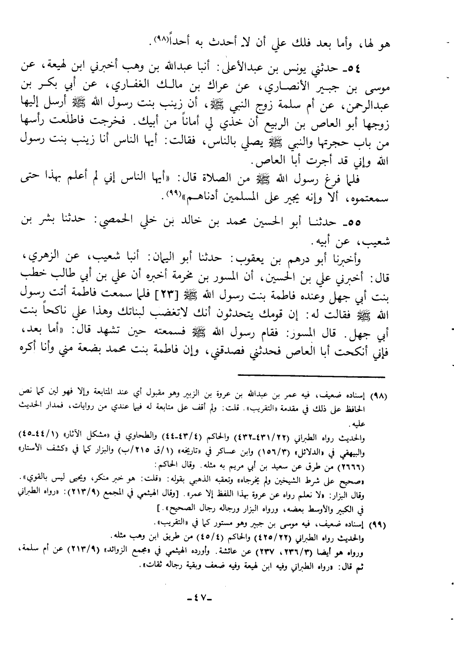 54 - حَدَّثَنِي يُونُسُ بْنُ عَبْدِ الْأَعْلَى، أنبا عَبْدُ اللَّهِ بْنُ وَهْبٍ، أَخْبَرَنِي ابْنُ لَهِيعَةَ، عَنْ مُوسَى بْنِ جُبَيْرٍ الْأَنْصَارِيِّ، عَنْ عِرَاكِ بْنِ مَالِكٍ الْغِفَارِيِّ، عَنْ أَبِي بَكْرِ بْنِ عَبْدِ الرَّحْمَنِ، عَنْ أُمِّ سَلَمَةَ، زَوْجِ النَّبِيِّ صَلَّى اللهُ عَلَيْهِ وَسَلَّمَ أَنَّ زَيْنَبَ بِنْتَ رَسُولِ اللَّهِ صَلَّى اللهُ عَلَيْهِ وَسَلَّمَ، أَرْسَلَ إِلَيْهَا زَوْجُهَا أَبُو الْعَاصِ بْنُ الرَّبِيعِ أَنْ خُذِي لِي أَمَانًا مِنْ أَبِيكِ فَخَرَجَتْ فَأَطْلَعَتْ رَأْسَهَا مِنْ بَابِ حُجْرَتِهَا وَالنَّبِيُّ صَلَّى اللهُ عَلَيْهِ وَسَلَّمَ يُصَلِّي بِالنَّاسِ فَقَالَتْ: أَيُّهَا النَّاسُ أَنَا زَيْنَبُ بِنْتُ رَسُولِ اللَّهِ وَإِنِّي قَدْ أَجَرْتُ أَبَا الْعَاصِ فَلَمَّا فَرَغَ رَسُولُ اللَّهِ صَلَّى اللهُ عَلَيْهِ وَسَلَّمَ مِنَ الصَّلَاةِ قَالَ: «§أَيُّهَا النَّاسُ إِنِّي لَمْ أَعْلَمْ بِهَذَا حَتَّى سَمِعْتُمُوهُ أَلَا وَإِنَّهُ يُجِيرُ عَلَى الْمُسْلِمِينَ أَدْنَاهُمْ»