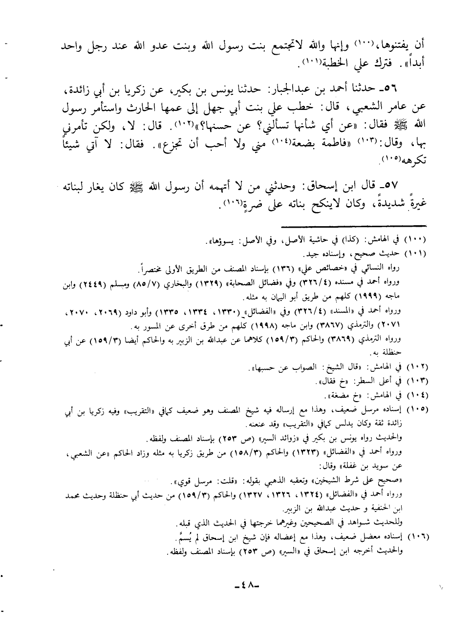56 - حَدَّثَنَا أَحْمَدُ بْنُ عَبْدِ الْجَبَّارِ، حَدَّثَنَا يُونُسُ بْنُ بُكَيْرٍ، عَنْ زَكَرِيَّا بْنِ أَبِي زَائِدَةَ، عَنْ عَامِرٍ الشَّعْبِيِّ، قَالَ: خَطَبَ عَلِيٌّ بِنْتَ أَبِي جَهْلٍ إِلَى عَمِّهَا الْحَارِثِ وَاسْتَأْمَرَ رَسُولَ اللَّهِ صَلَّى اللهُ عَلَيْهِ وَسَلَّمَ فَقَالَ: «عَنْ أَيِّ شَأْنِهَا تَسْأَلُنِي؟ عَنْ حُسْنِهَا» ، قَالَ: لَا وَلَكِنْ تَأْمُرُنِي بِهَا، وَقَالَ: «§فَاطِمَةُ بَضْعَةٌ مِنِّي وَلَا أُحِبُّ أَنْ تُجْزَعَ» فَقَالَ: لَا آتِي شَيْئًا تَكْرَهُهُ "