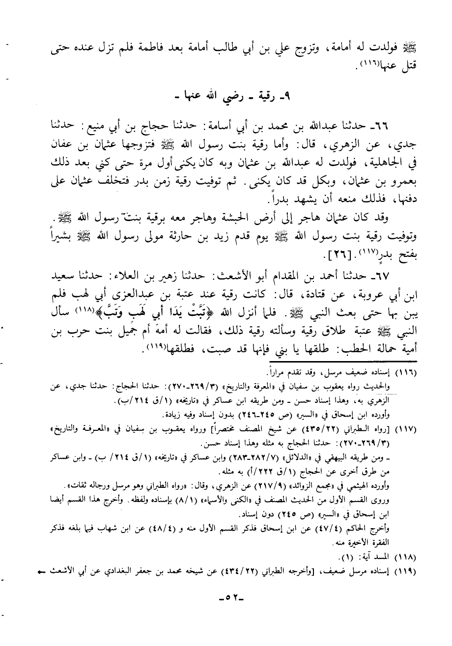 66 - حَدَّثَنَا عَبْدُ اللَّهِ بْنُ مُحَمَّدِ بْنِ أَبِي أُسَامَةَ، حَدَّثَنَا حَجَّاجُ بْنُ أَبِي مَنِيعٍ، حَدَّثَنَا جَدِّي، عَنِ الزُّهْرِيِّ، قَالَ: «§وَأَمَّا رُقَيَّةُ بِنْتُ رَسُولِ اللَّهِ صَلَّى اللهُ عَلَيْهِ وَسَلَّمَ فَتَزَوَّجَهَا عُثْمَانُ بْنُ عَفَّانَ فِي الْجَاهِلِيَّةِ فَوَلَدَتْ لَهُ عَبْدَ اللَّهِ بْنَ عُثْمَانَ وَبِهِ كَانَ يُكَنَّى أَوَّلَ مَرَّةٍ حَتَّى كُنِّيَ بَعْدَ ذَلِكَ بِعَمْرِو بْنِ عُثْمَانَ وَبِكُلٍّ قَدْ كَانَ يُكَنَّى ثُمَّ تُوُفِّيَتْ رُقَيَّةُ زَمَنَ بَدْرٍ فَتَخَلَّفَ عُثْمَانُ عَلَى دَفْنِهَا فَذَلِكَ مَنَعَهُ أَنْ يَشْهَدَ بَدْرًا وَقَدْ كَانَ عُثْمَانُ هَاجَرَ إِلَى أَرْضِ الْحَبَشَةِ وَهَاجَرَ مَعَهُ بِرُقَيَّةَ بِنْتِ رَسُولِ اللَّهِ صَلَّى اللهُ عَلَيْهِ وَسَلَّمَ وَتُوُفِّيَتْ رُقَيَّةُ بِنْتُ رَسُولِ اللَّهِ صَلَّى اللهُ عَلَيْهِ وَسَلَّمَ يَوْمَ قَدِمَ زَيْدُ بْنُ حَارِثَةَ مَوْلَى رَسُولِ اللَّهِ صَلَّى اللهُ عَلَيْهِ وَسَلَّمَ بَشِيرًا بِفَتْحِ بَدْرٍ»