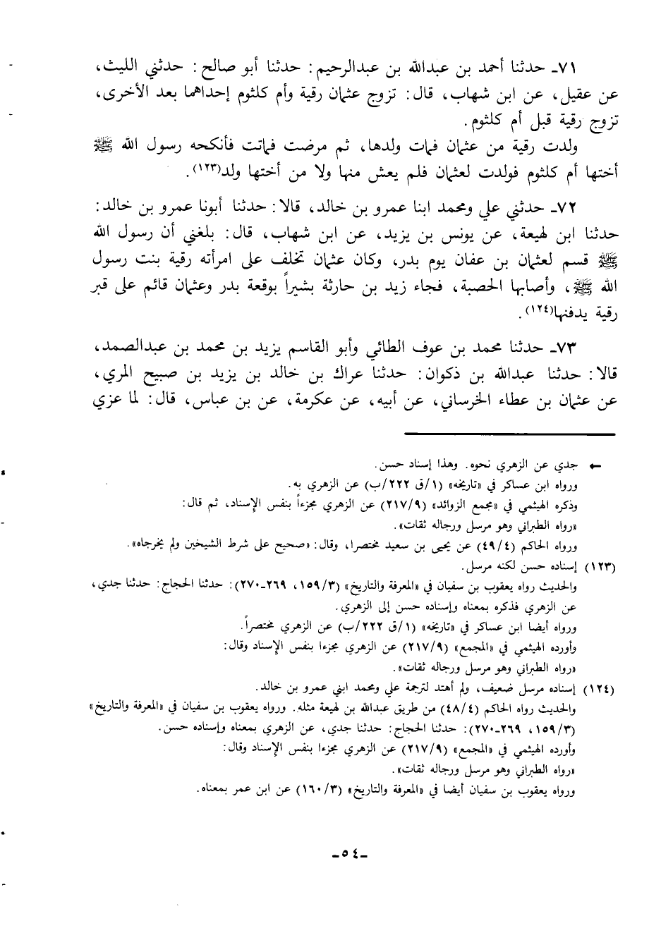 72 - حَدَّثَنِي عَلِيٌّ، وَمُحَمَّدُ، ابْنَا عَمْرِو بْنِ خَالِدٍ قَالَا: حَدَّثَنَا أَبُونَا عَمْرُو بْنُ خَالِدٍ حَدَّثَنَا ابْنُ لَهِيعَةَ، عَنْ يُونُسَ بْنِ يَزِيدَ، عَنِ ابْنِ شِهَابٍ، قَالَ: «§بَلَغَنِي أَنَّ رَسُولَ اللَّهِ صَلَّى اللهُ عَلَيْهِ وَسَلَّمَ قَسَمَ لِعُثْمَانَ بْنَ عَفَّانَ يَوْمَ بَدْرٍ وَكَانَ عُثْمَانُ تَخَلَّفَ عَلَى امْرَأَتِهِ رُقَيَّةَ بِنْتِ رَسُولِ اللَّهِ صَلَّى اللهُ عَلَيْهِ وَسَلَّمَ وَأَصَابَهَا الْحَصْبَةُ فَجَاءَ زَيْدُ بْنُ حَارِثَةَ بَشِيرًا بِوَقْعَةِ بَدْرٍ وَعُثْمَانُ قَائِمٌ عَلَى قَبْرِ رُقَيَّةَ يَدْفِنُهَا»
