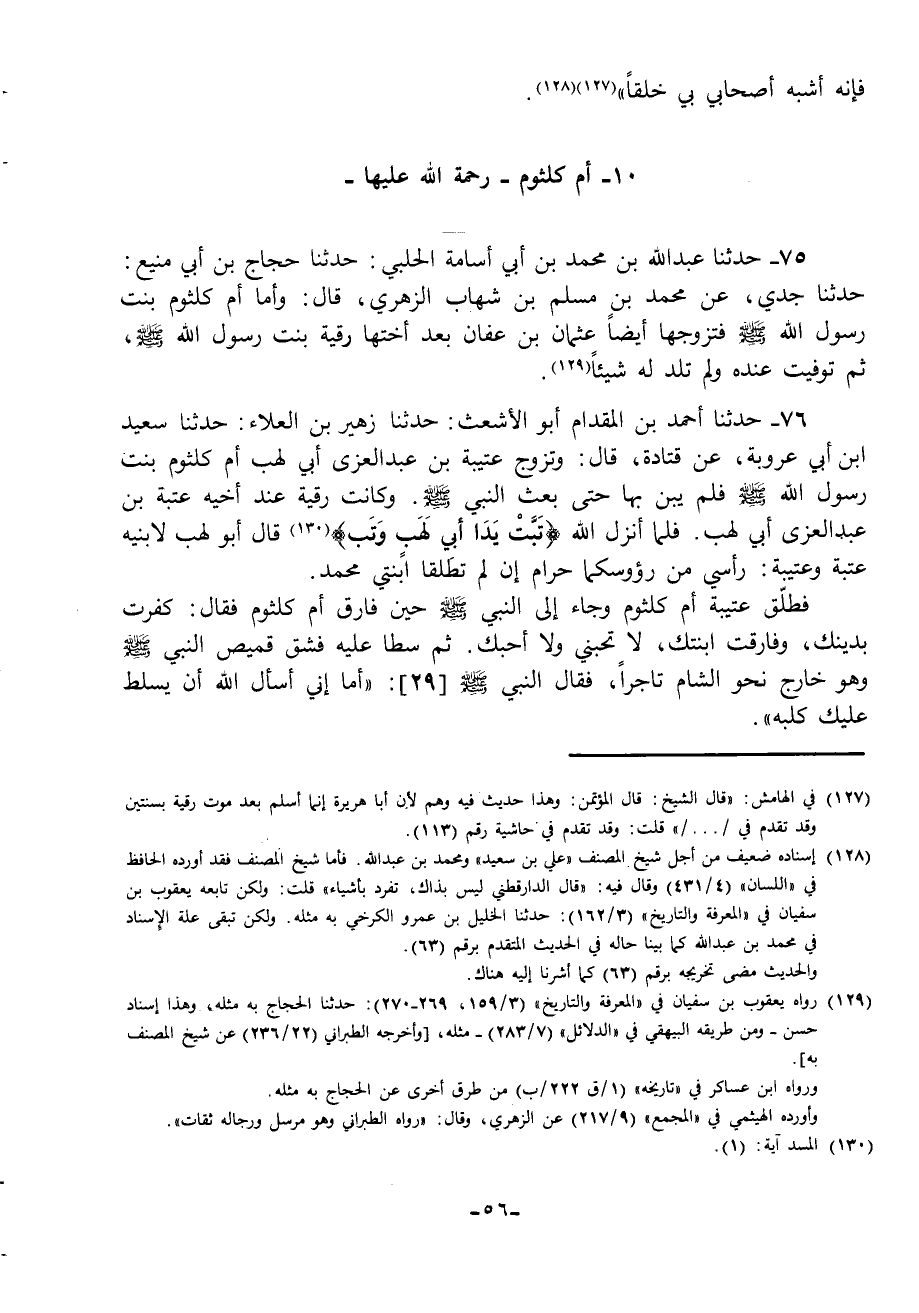 75 - حَدَّثَنَا عَبْدُ اللَّهِ بْنُ مُحَمَّدِ بْنِ أَبِي أُسَامَةَ الْحَلَبِيُّ، حَدَّثَنَا حَجَّاجُ بْنُ أَبِي مَنِيعٍ، حَدَّثَنَا جَدِّي، عَنْ مُحَمَّدِ بْنِ مُسْلِمِ بْنِ شِهَابٍ الزُّهْرِيِّ، قَالَ: «§وَأَمَّا أُمُّ كُلْثُومٍ بِنْتُ رَسُولِ اللَّهِ صَلَّى اللهُ عَلَيْهِ وَسَلَّمَ فَتَزَوَّجَهَا أَيْضًا عُثْمَانُ بْنُ عَفَّانَ بَعْدَ أُخْتِهَا رُقَيَّةَ بِنْتِ رَسُولِ اللَّهِ صَلَّى اللهُ عَلَيْهِ وَسَلَّمَ ثُمَّ تُوُفِّيَتْ عِنْدَهُ وَلَمْ تَلِدْ لَهُ شَيْئًا»