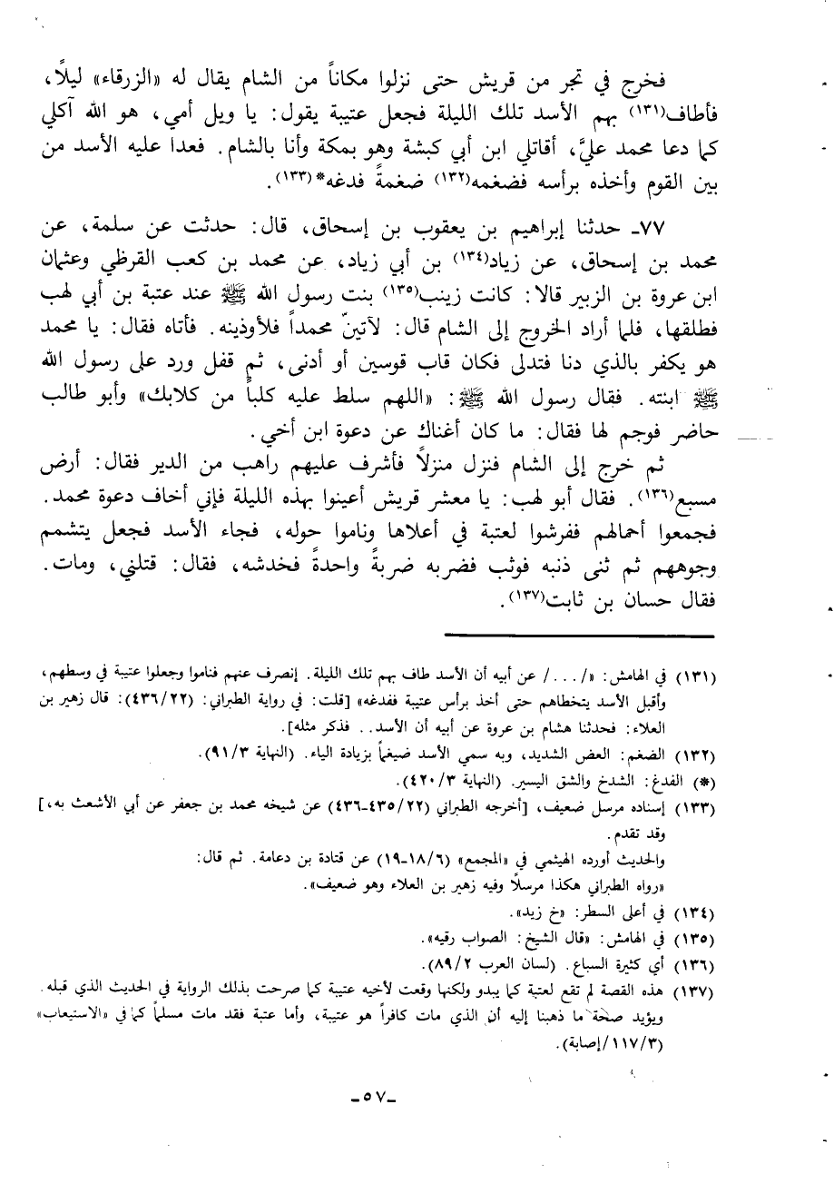 77 - حَدَّثَنَا إِبْرَاهِيمُ بْنُ يَعْقُوبَ بْنِ إِسْحَاقَ، قَالَ حُدِّثْتُ عَنْ سَلَمَةَ، عَنْ مُحَمَّدِ بْنِ إِسْحَاقَ، عَنْ زِيَادِ بْنِ أَبِي زِيَادٍ، عَنْ مُحَمَّدِ بْنِ كَعْبٍ الْقُرَظِيِّ، وَعُثْمَانَ بْنِ عُرْوَةَ بْنِ الزُّبَيْرِ، قَالَا: §كَانَتْ زَيْنَبُ بِنْتُ رَسُولِ اللَّهِ صَلَّى اللهُ عَلَيْهِ وَسَلَّمَ عِنْدَ عُتْبَةَ بْنِ أَبِي لَهَبٍ فَطَلَّقَهَا فَلَمَّا أَرَادَ الْخُرُوجَ إِلَى الشَّامِ قَالَ: لَآتِيَنَّ مُحَمَّدًا فَلَأُوذِيَنَّهُ، فَأَتَاهُ فَقَالَ: يَا مُحَمَّدُ هُوَ يُكْفُرُ بِالَّذِي دَنَا فَتَدَلَّى فَكَانَ قَابَ قَوْسَيْنِ أَوْ أَدْنَى ثُمَّ قَفَلَ وَرَدَّ عَلَى رَسُولِ اللَّهِ صَلَّى اللهُ عَلَيْهِ وَسَلَّمَ ابْنَتَهُ فَقَالَ رَسُولُ اللَّهِ صَلَّى اللهُ عَلَيْهِ وَسَلَّمَ: «اللَّهُمَّ سَلِّطْ عَلَيْهِ كَلْبًا مِنْ كِلَابِكَ» ، وَأَبُو طَالِبٍ حَاضِرٌ فَوَجَمَ لَهَا فَقَالَ: مَا كَانَ أَغْنَاكَ عَنْ دَعْوَةِ ابْنِ أَخِي ثُمَّ خَرَجَ إِلَى الشَّامِ فَنَزَلَ مَنْزِلًا فَأَشْرَفَ عَلَيْهِمْ رَاهِبٌ مِنَ الدَّيْرِ فَقَالَ: أَرْضُ مَسْبَعٍ فَقَالَ أَبُو لَهَبٍ: يَا مَعْشَرَ قُرَيْشٍ أَعِينُوا بِهَذِهِ اللَّيْلَةِ فَإِنِّي أَخَافُ دَعْوَةَ مُحَمَّدٍ فَجَمَعُوا أَحْمَالَهُمْ فَفَرَشُوا لِعُتْبَةَ فِي أَعْلَاهَا وَنَامُوا حَوْلَهُ فَجَاءَ الْأَسَدُ فَجَعَلَ يَتَشَمَّمُ وُجُوهَهُمْ ثُمَّ ثَنَّى ذَنْبَهُ فَوَثَبَ فَضَرَبَهُ ضَرْبَةً وَاحِدَةً فَخَدَشَهُ فَقَالَ: قَتَلَنِي وَمَاتَ فَقَالَ حَسَّانُ بْنُ ثَابِتٍ:
