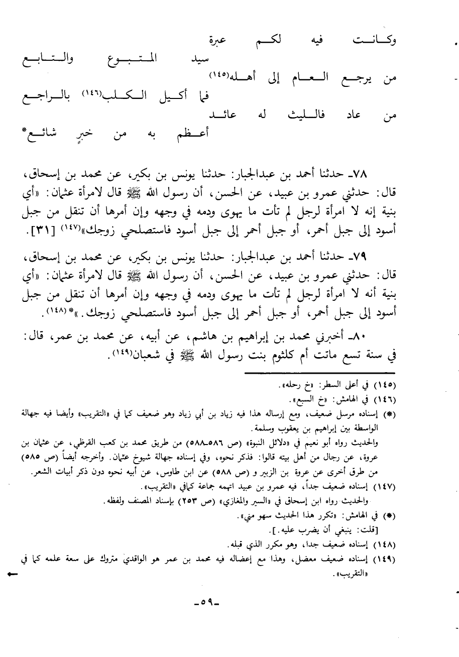 79 - حَدَّثَنَا أَحْمَدُ بْنُ عَبْدِ الْجَبَّارِ، حَدَّثَنَا يُونُسُ بْنُ بُكَيْرٍ، عَنْ مُحَمَّدِ بْنِ إِسْحَاقَ، قَالَ: حَدَّثَنِي عَمْرُو بْنُ عُبَيْدٍ، عَنِ الْحَسَنِ، أَنَّ رَسُولَ اللَّهِ صَلَّى اللهُ عَلَيْهِ وَسَلَّمَ قَالَ لِامْرَأَةِ عُثْمَانَ: «أَيْ بُنَيَّةُ إِنَّهُ §لَا امْرَأَةَ لِرَجُلٍ لَمْ تَأْتِ مَا يَهْوَى وَدَمُهُ فِي وَجْهِهِ وَإِنْ أَمَرَهَا أَنْ تَنْقُلَ مِنْ جَبَلٍ أَسْوَدَ إِلَى جَبَلٍ أَحْمَرَ أَوْ جَبَلٍ أَحْمَرَ إِلَى جَبَلٍ أَسْوَدَ فَاسْتَصْلِحِي زَوْجَكِ»