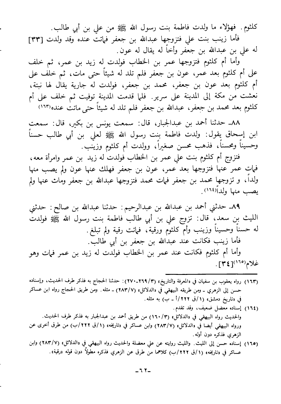 88 - حَدَّثَنَا أَحْمَدُ بْنُ عَبْدِ الْجَبَّارِ، قَالَ: سَمِعْتُ يُونُسَ بْنَ بُكَيْرٍ، قَالَ: سَمِعْتُ ابْنَ إِسْحَاقَ، يَقُولُ: «§وَلَدَتْ فَاطِمَةُ بِنْتُ رَسُولِ اللَّهِ صَلَّى اللهُ عَلَيْهِ وَسَلَّمَ لِعَلِيِّ بْنِ أَبِي طَالِبٍ حَسَنًا وَحُسَيْنًا وَمُحْسِنًا فَذَهَبَ مُحْسِنٌ صَغِيرًا وَوَلَدَتْ أُمَّ كُلْثُومٍ وَزَيْنَبَ فَتَزَوَّجَ أُمَّ كُلْثُومٍ بِنْتَ عَلِيٍّ عُمَرُ بْنُ الْخَطَّابِ فَوَلَدَتْ لَهُ زَيْدَ بْنَ عُمَرَ وَامْرَأَةً مَعَهُ فَمَاتَ عُمَرُ عَنْهَا فَتَزَوَّجَهَا بَعْدَ عُمَرَ عَوْنُ بْنُ جَعْفَرٍ فَهَلَكَ عَنْهَا عَوْنٌ وَلَمْ يُصِبْ مِنْهَا وَلَدًا وَتَزَوَّجَهَا مُحَمَّدُ بْنُ جَعْفَرٍ فَمَاتَ مُحَمَّدٌ فَتَزَوَّجَهَا عَبْدُ اللَّهِ بْنُ جَعْفَرٍ وَمَاتَ عَنْهَا وَلَمْ يُصِبْ مِنْهَا وَلَدًا»