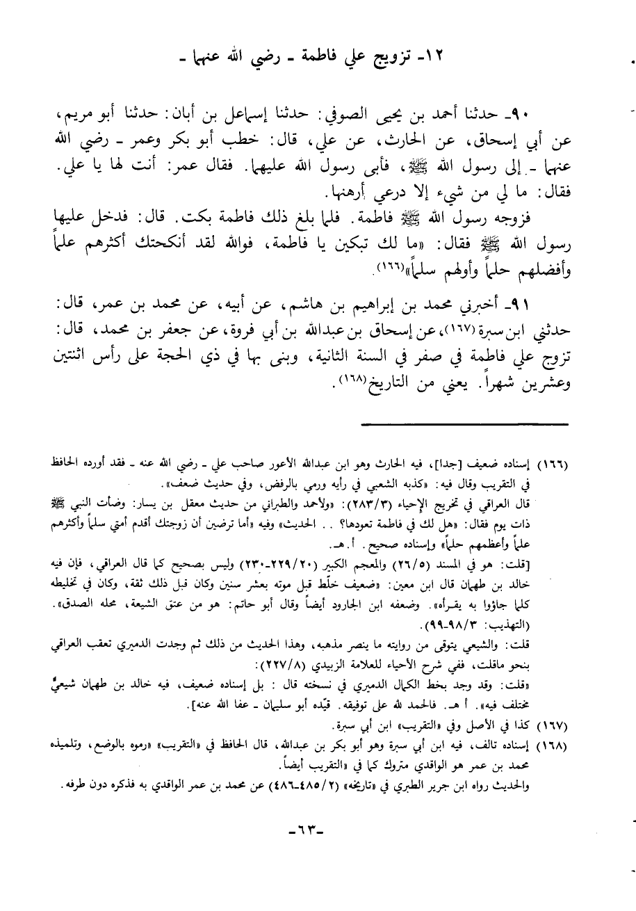 91 - أَخْبَرَنِي مُحَمَّدُ بْنُ إِبْرَاهِيمَ بْنِ هَاشِمٍ، عَنْ أَبِيهِ، عَنْ مُحَمَّدِ بْنِ عُمَرَ، قَالَ: حَدَّثَنِي ابْنُ سَبْرَةَ، عَنْ إِسْحَاقَ بْنِ عَبْدِ اللَّهِ بْنِ أَبِي فَرْوَةَ، عَنْ جَعْفَرِ بْنِ مُحَمَّدٍ، قَالَ: «§تَزَوَّجَ عَلِيُّ فَاطِمَةَ فِي صَفَرٍ فِي السَّنَةِ الثَّانِيَةِ وَبَنَى بِهَا فِي ذِي الْحِجَّةِ عَلَى رَأْسِ اثْنَتَيْنِ وَعِشْرِينَ شَهْرًا يَعْنِي مِنَ التَّارِيخِ»