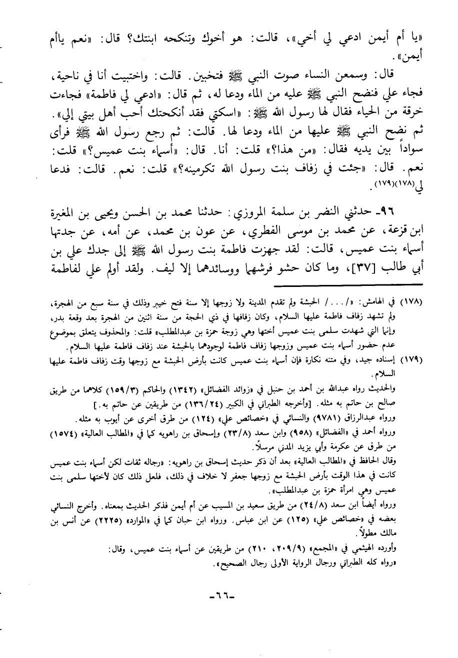 96 - حَدَّثَنِي النَّضْرُ بْنُ سَلَمَةَ الْمَرْوَزِيِّ، حَدَّثَنَا مُحَمَّدُ بْنُ الْحَسَنِ، وَيَحْيَى بْنُ الْمُغِيرَةِ بْنِ قَزَعَةَ، عَنْ مُحَمَّدِ بْنِ مُوسَى الْفِطْرِيِّ، عَنْ عَوْنِ بْنِ مُحَمَّدٍ، عَنْ أُمِّهِ، عَنْ جَدَّتِهَا أَسْمَاءَ بِنْتِ عُمَيْسٍ قَالَتْ: «§لَقَدْ جَهَّزْتُ فَاطِمَةَ بِنْتَ رَسُولِ اللَّهِ صَلَّى اللهُ عَلَيْهِ وَسَلَّمَ إِلَى جَدِّكِ عَلِيِّ بْنِ أَبِي طَالِبٍ وَمَا كَانَ حَشْوُ فَرْشِهِمَا وَوَسَائِدِهِمَا إِلَّا لِيفٌ، وَلَقَدْ أَوَلَمْ عَلِيٌّ لِفَاطِمَةَ فَمَا كَانَ وَلِيمَةُ ذَلِكَ الزَّمَانِ أَفْضَلَ مِنْ وَلِيمَتِهِ، رَهَنَ عَلِيٌّ دِرْعَهُ عِنْدَ يَهُودِيٍّ بِشَطْرِ شَعِيرٍ وَكَانَتْ وَلِيمَتُهُ آصُعًا مِنْ شَعِيرٍ وَتَمْرٍ وَحُلَيْسٍ»