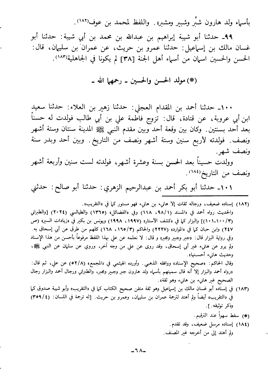 101 - حَدَّثَنَا أَبُو بَكْرٍ أَحْمَدُ بْنُ عَبْدِ الرَّحِيمِ الزُّهْرِيُّ حَدَّثَنَا أَبُو صَالِحٍ، حَدَّثَنِي اللَّيْثُ بْنُ سَعْدٍ، قَالَ: «§وَلَدَتْ فَاطِمَةُ بِنْتُ رَسُولِ اللَّهِ صَلَّى اللهُ عَلَيْهِ وَسَلَّمَ -[69]- الْحَسَنَ بْنَ عَلِيٍّ فِي شَهْرِ رَمَضَانَ سَنَةَ ثَلَاثٍ وَوَلَدَتِ الْحُسَيْنَ فِي لَيَالٍ خَلَوْنَ مِنْ شَعْبَانَ سَنَةَ أَرْبَعٍ»