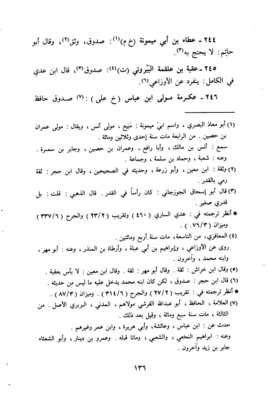 صدوق حافظ عالم كذبه مجاهد وابن سيرين ومالك وقال حماد قيل لأيوب أكانوا يتهمون عكرمة فقال أما أنا فلم أكن أتهمه وقال أحمد كان يرى رأي الخوارج الصفيرية وقال ابن المديني كان عكرمة يرى رأي نجدة وقد وثقه جماعة واحتجوا به
