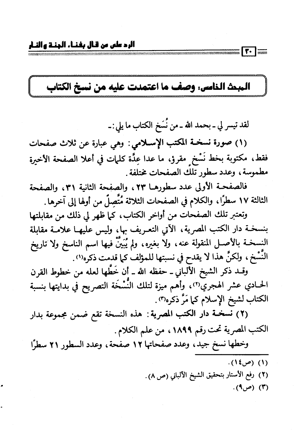 وقد ذكر الشيخ الألباني - حفظه الله - أن خطها لعله من خطوط القرن الحادي عشر الهجري (¬2) ، وأهم ميزة لتلك النسخة التصريح في بدايتها بنسبة الكتاب لشيخ الإسلام كما مر ذكره (¬3) .
