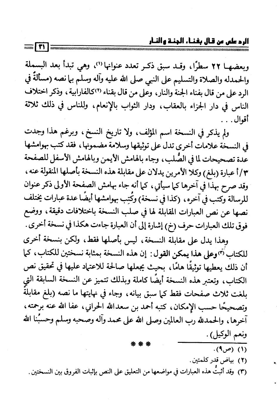 وبعضها 22سطرا، وقد سبق ذكر تعدد عنوانها (¬1) ، وهي تبدأ بعد البسملة والحمد له والصلاة والتسليم على النبي صلى الله عليه وسلم بما نصه "مسألة في الرد على من قال بفناء الجنة والنار، وعلى من قال بفناء (¬2) كالفارابية، وذكر اختلاف الناس في دار الجزاء بالعقاب، ودار الثواب بالإنعام، للناس في ذلك ثلاثة أقوال ...