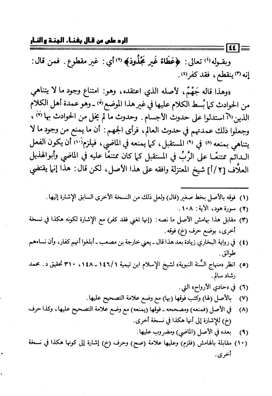 وبقوله (¬1) تعالى: {عَطَاءً غَيْرَ مَجْذُوذٍ} (¬2) . أي: غير مقطوع. فمن قال: إنه (¬3) ينقطع، فقد كفر (¬4) .