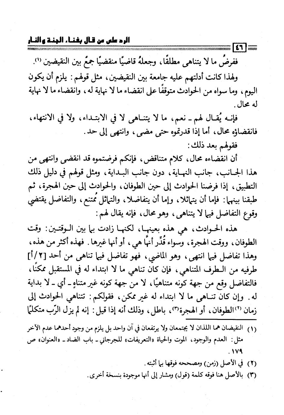 أن انقضاءه محال، كلام متناقض، فإنكم فرضتموه قد انقضى وانتهى من هذا الجانب، جانب النهاية، دون جانب البداية، ومثل قولهم في دليل ذلك التطبيق، إذا فرضنا الحوادث إلى حين الطوفان، والحوادث إلى حين الهجرة، ثم طبقنا بينهما: فإما أن يتماثلا، وإما أن يتفاضلا، والتماثل ممتنع، والتفاضل يقتضي وقوع التفاضل فيما لا يتناهى، وهو محال، فإنه يقال لهم: