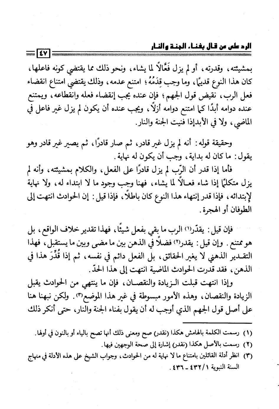 (¬3) انظر أدلة القائلين بامتناع ما نهاية له من الحوادث، وجواب الشيخ على هذه الأدلة في منهاج السنة النبوية 1/432-436.