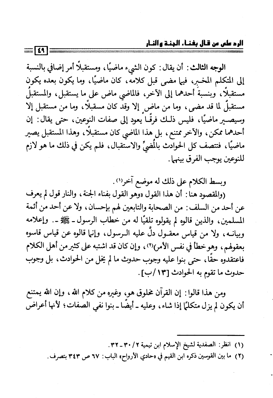 "والمقصود هنا: أن هذا القول "هو القول بفناء الجنة، والنار قول لم يعرف عن أحد من السلف: من الصحابة والتابعين لهم بإحسان، ولا عن أحد من أئمة المسلمين، والذين قالوه لم يقولوه تلقيا له من خطاب الرسول صلى الله عليه وسلم. وإعلامه وبيانه، ولا من قياس معقول دل عليه الرسول، وإنما قالوه عن قياس قاسوه بعقولهم، وهو خطأ في نفس الأمر" (¬2) ، وإن كان قد اشتبه على كثير من أهل الكلام فاعتقدوه حقا، حتى بنوا عليه وجوب حدوث ما لم يخل من الحوادث، بل وجوب حدوث ما تقوم به الحوادث "13/ب".