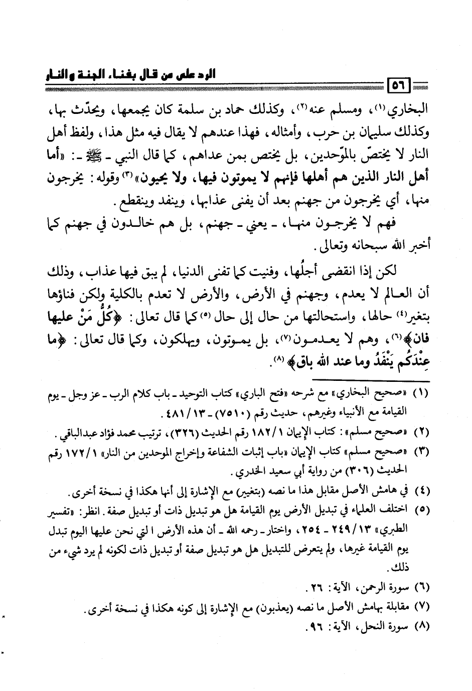 البخاري (¬1) ، ومسلم عنه (¬2) ، وكذلك حماد بن سلمة كان يجمعها، ويحدث بها، وكذلك سليمان بن حرب، وأمثاله، فهذا عندهم لا يقال فيه مثل هذا، ولفظ أهل النار لا يختص بالموحدين، بل يختص بمن عداهم، كما قاتل النبي صلى الله عيه وسلم: "أما أهل النار الذين هم أهلها فإنهم لا يموتون فيها، ولا يحيون" (¬3) . وقوله: يخرجون منها، أي يخرجون من جهنم بعد أن يفنى عذابها، وينفذ وينقطع.