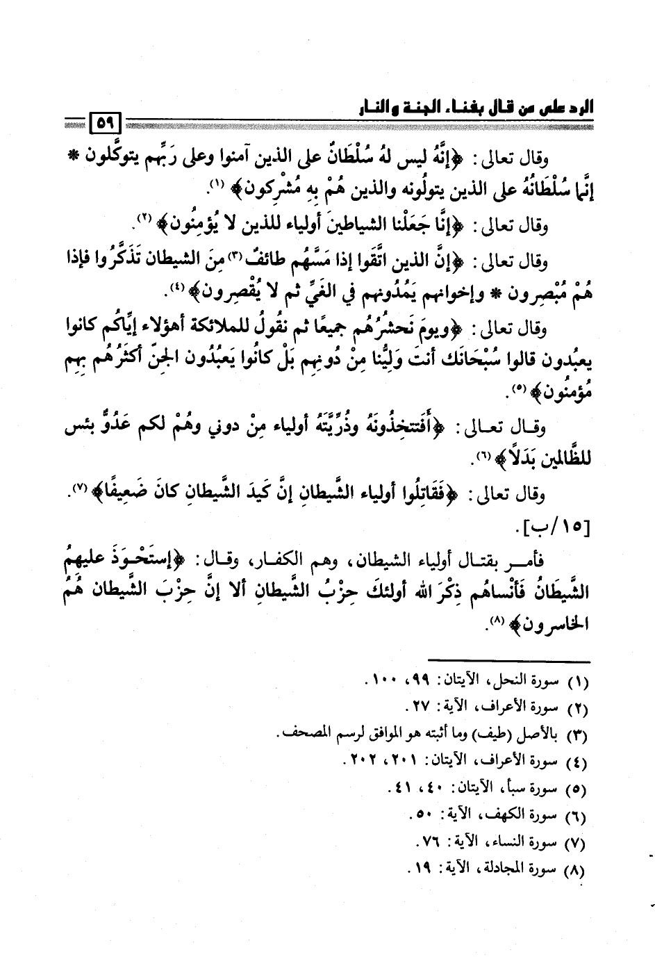 فأمر بقتال أولياء الشيطان، وهم الكفار، وقال: {اسْتَحْوَذَ عَلَيْهِمُ الشَّيْطَانُ فَأَنْسَاهُمْ ذِكْرَ اللَّهِ أُولَئِكَ حِزْبُ الشَّيْطَانِ أَلا إِنَّ حِزْبَ الشَّيْطَانِ هُمُ الْخَاسِرُونَ} (¬8) .
