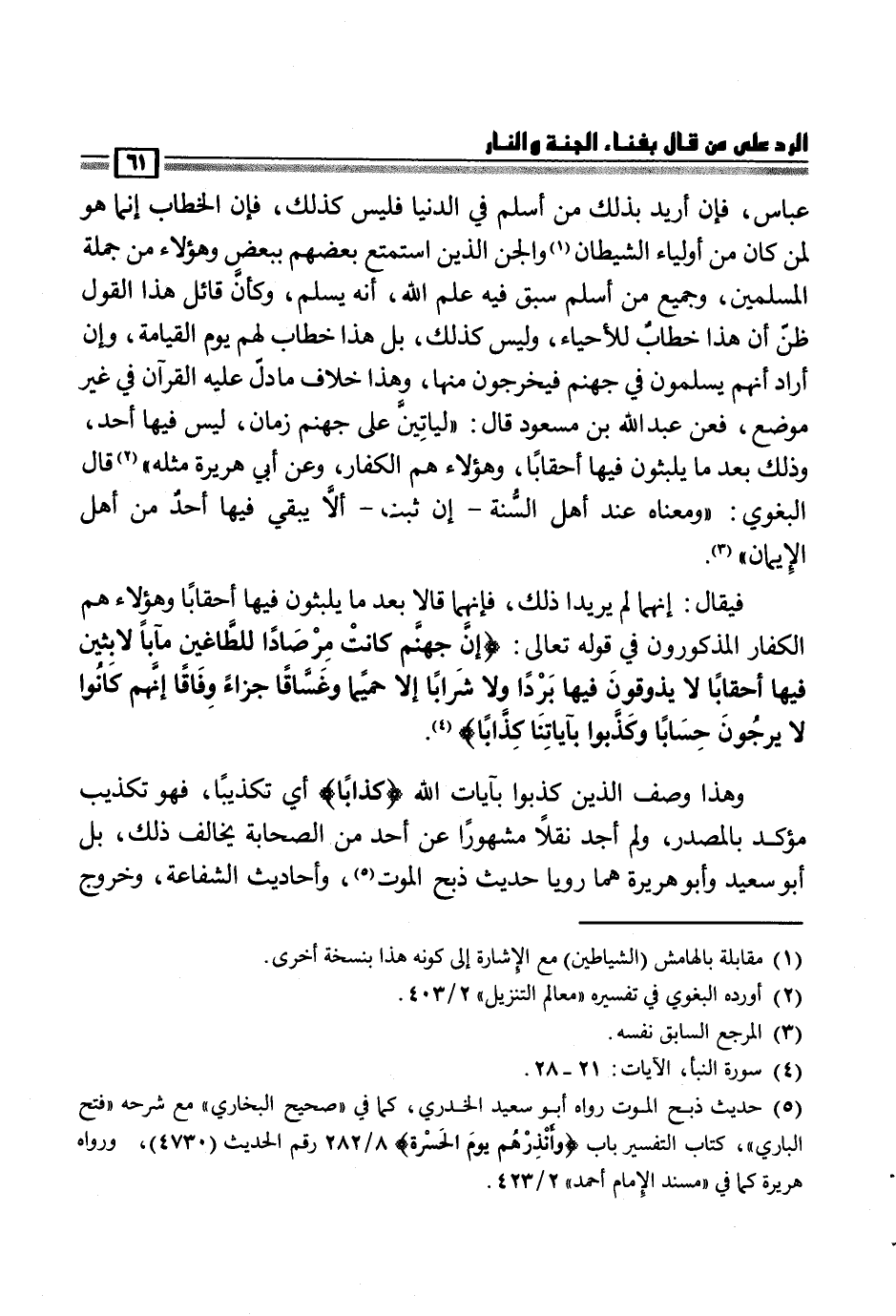 وهذا الوصف الذين كذبوا بآيات الله {كِذَّاباً} أي تكذيبا، فهو تكذيب مؤكد بالمصدر، ولم أجد نقلا مشهورا عن أحد من الصحابة يخالف ذلك، بل أبو سعيد وأبو هريرة هما رويا حديث ذبح الموت (¬5) ، وأحاديث الشفاعة، وخروج
