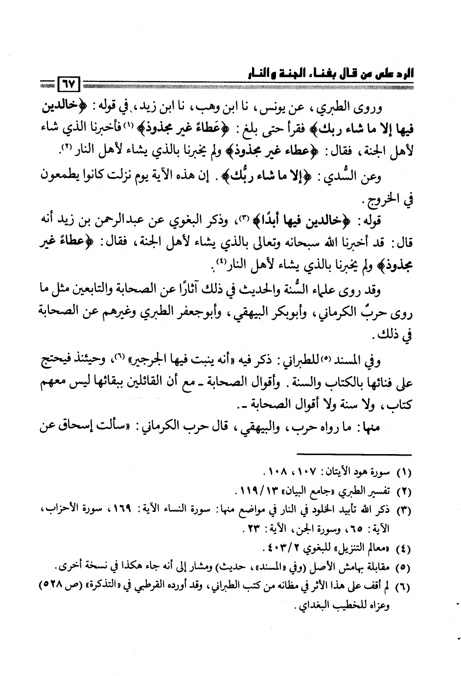 قوله: {خَالِدِينَ فِيهَا أَبَداً} (¬3) ، ذكر البغوي عن عبد الرحمن بن زيد أنه قال: قد أخبرنا الله سبحانه وتعالى بالذي لأهل الجنة، فقال: {عَطَاءً غَيْرَ مَجْذُوذٍ} ولم يخبرنا بالذي يشاء لأهل النار (¬4) .