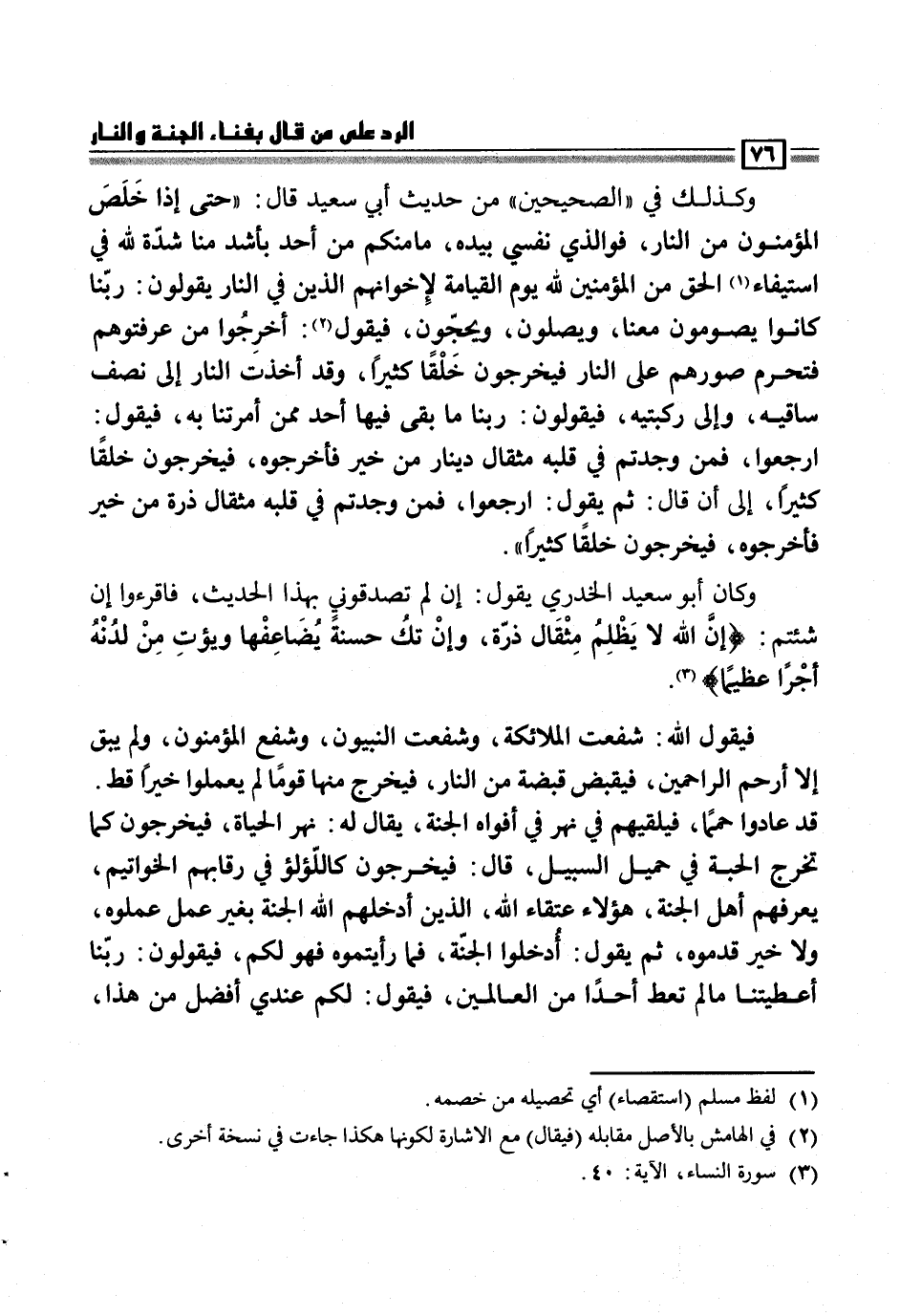 وكان أبو سعيد الخدري يقول: إن لم تصدقوني بهذا الحديث، فاقرءوا إن شئتم: {إِنَّ اللَّهَ لا يَظْلِمُ مِثْقَالَ ذَرَّةٍ وَإِنْ تَكُ حَسَنَةً يُضَاعِفْهَا وَيُؤْتِ مِنْ لَدُنْهُ أَجْراً عَظِيماً} (¬3) .