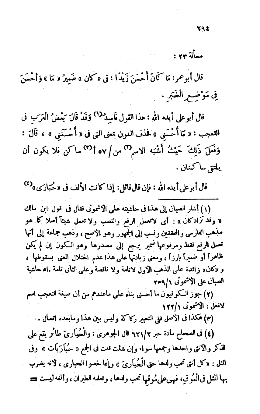قال أبو عمر: ما كان أحسن زيداً: في "كان" ضميرُ "ما" وأحسن في موضع الخبر.