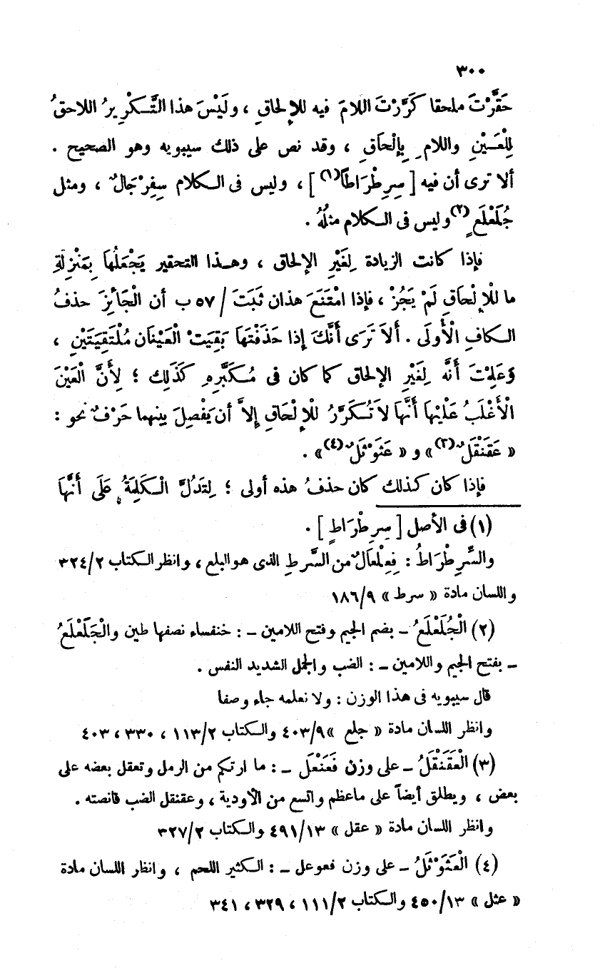 حَقَّرت ملحقا كررت اللام فيه للإلحاق، وليس هذا التكرير اللاحق للعين واللام بإلحاق، وقد نص على ذلك سيبويه وهو الصحيح. ألا ترى أن فيه [سرطراطًا]، وليس في الكلام سفر جال، ومثل جلعلعٍ وليس في الكلام مثله.