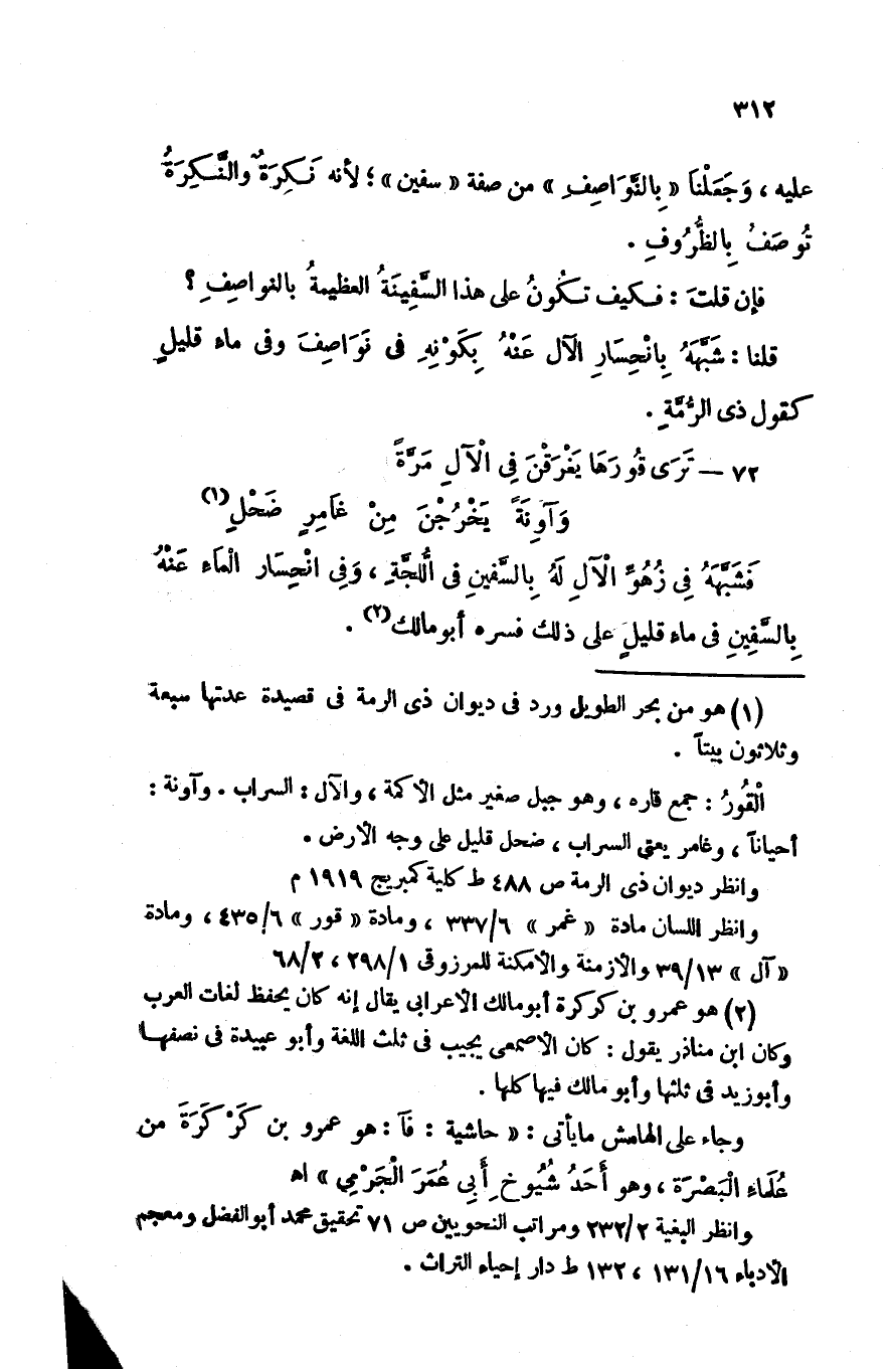 فشبهه في زهو الآل له بالسفين في اللجةٍ، وفي انحسار الماء عنه بالسفين في ماء قليلٍ على ذلك فسره أبو مالك.